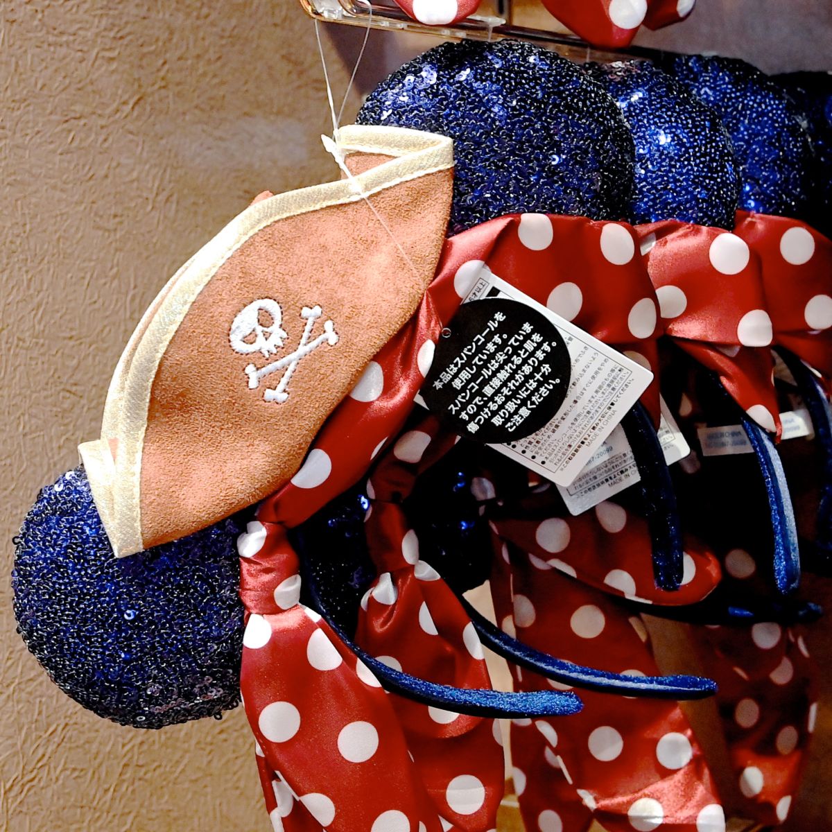 カチューシャは海賊帽、ドット柄のバンダナ、ブルーのスパンコールがかわいいパイレーツミニーマウスデザインが発売されました。