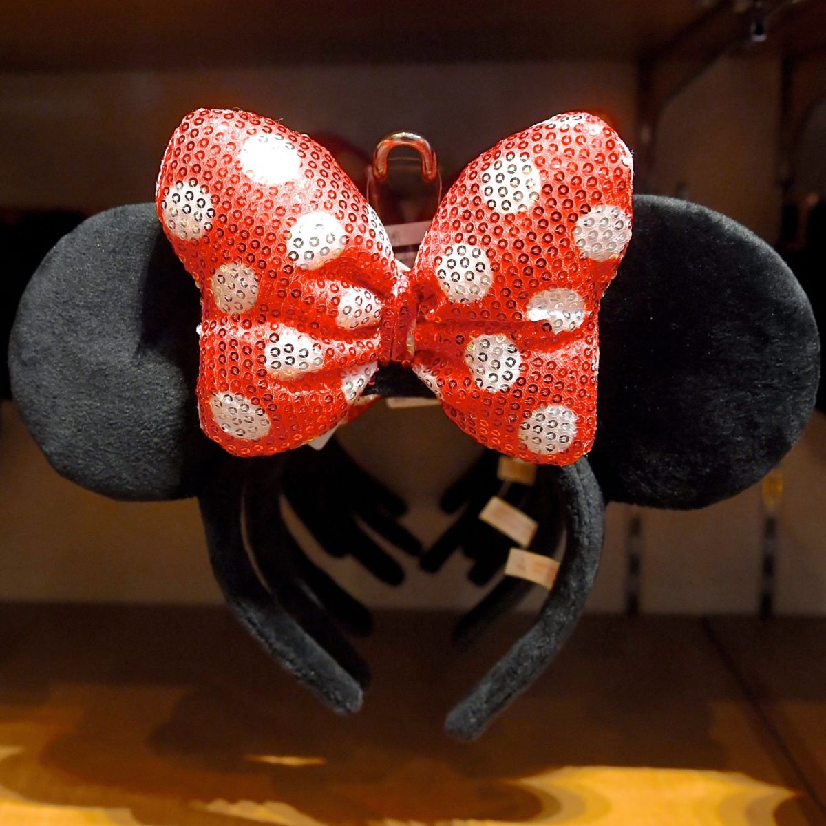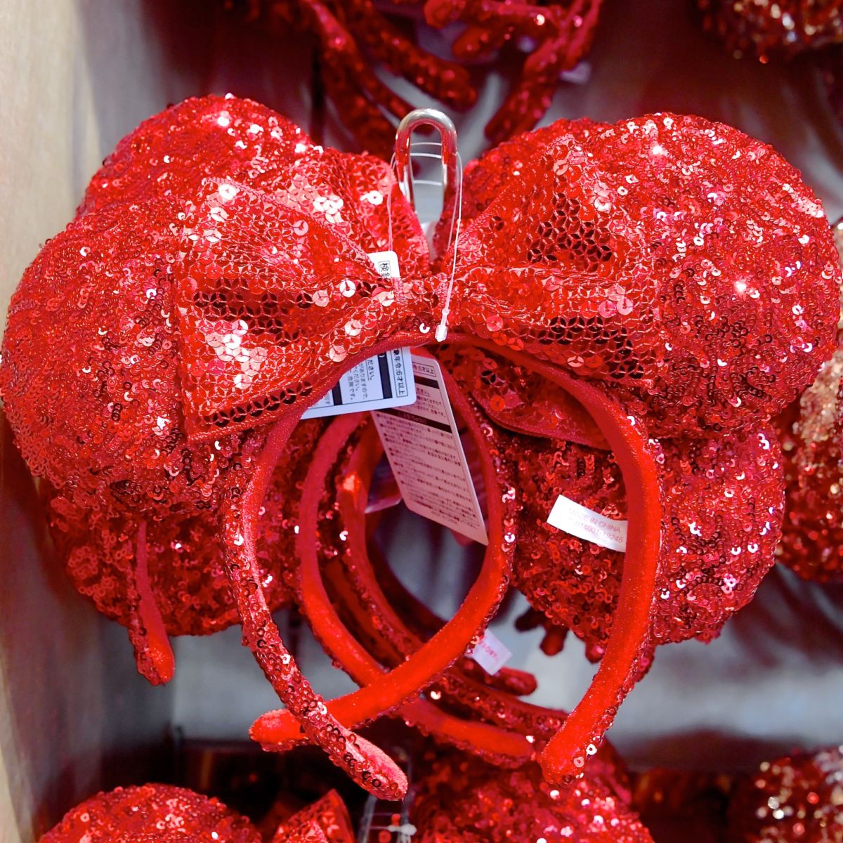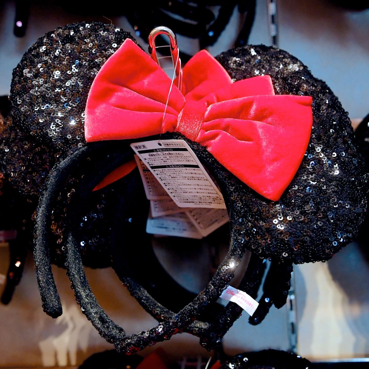 ブラックのスパンコールにベロア素材の真っ赤なリボンがデザインされたミニーカチューシャ。