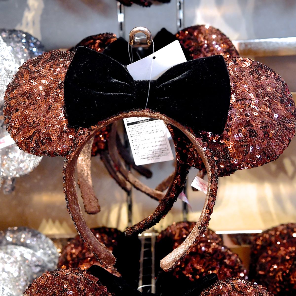 ブラウンのスパンコールに黒色のベロアリボンがデザインされたミニーカチューシャ。