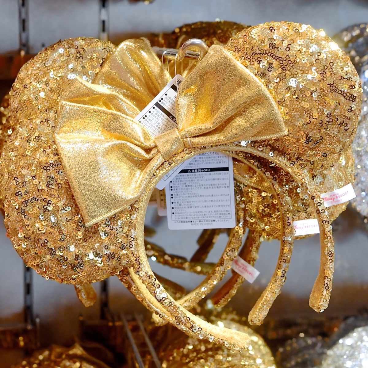 輝くゴールドのミニーデザインスパンコールカチューシャ。