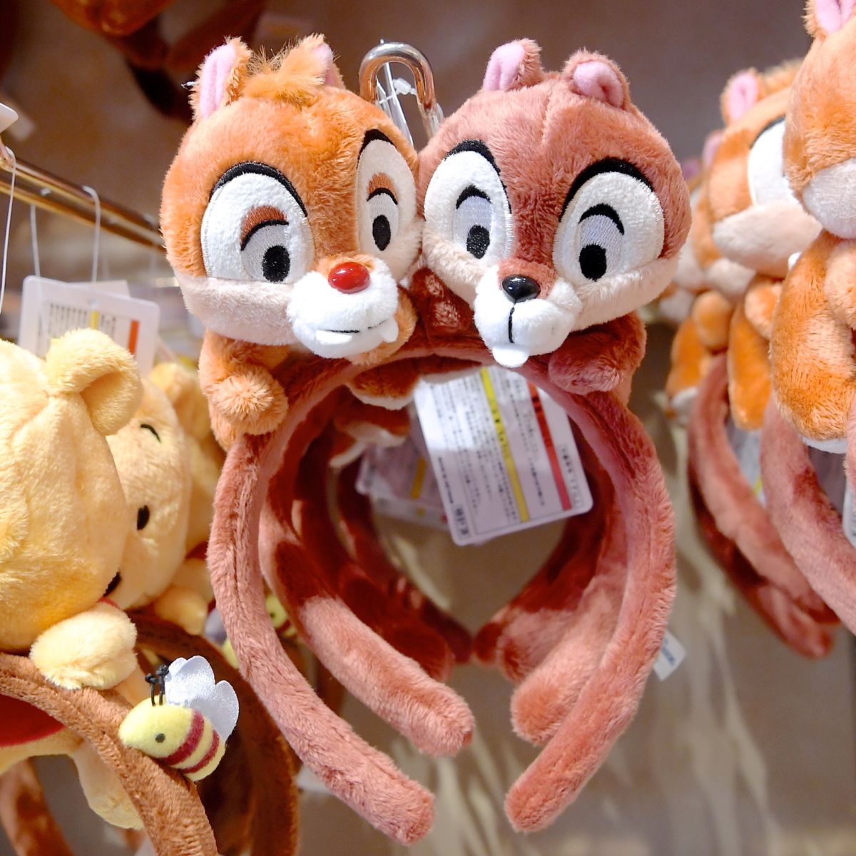 シマリスコンビ、チップ(お鼻が黒色、歯が1本)とデール(お鼻が赤色、歯が2本)のぬいぐるみがくっついたかわいいカチューシャ。