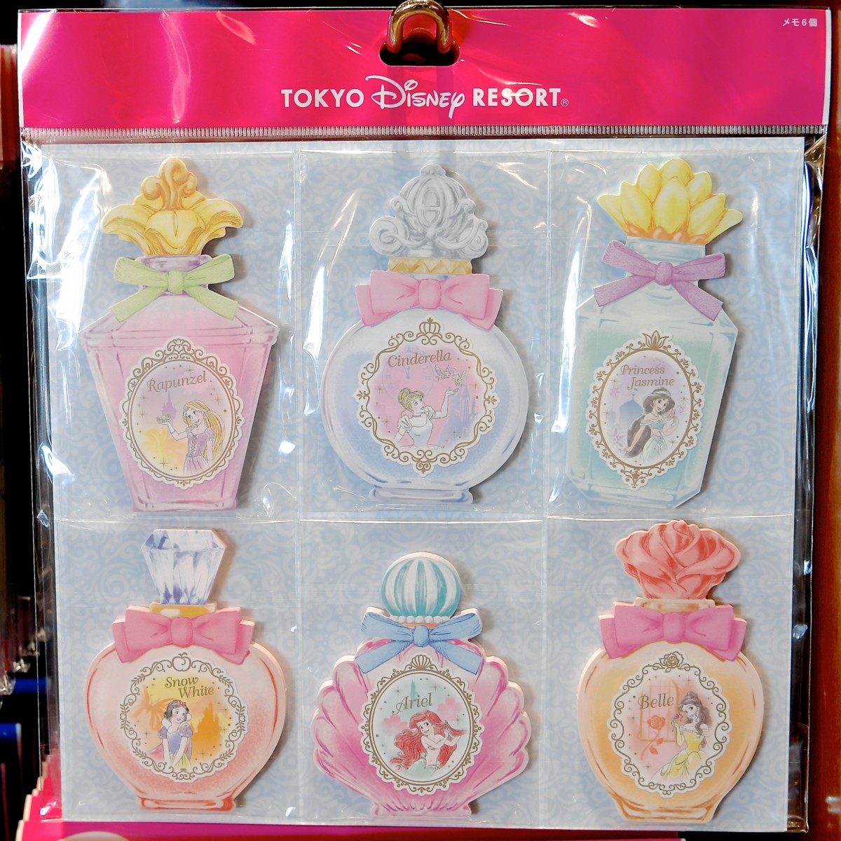 ディズニープリンセスたちがデザインされた香水型のメモ6冊セット。