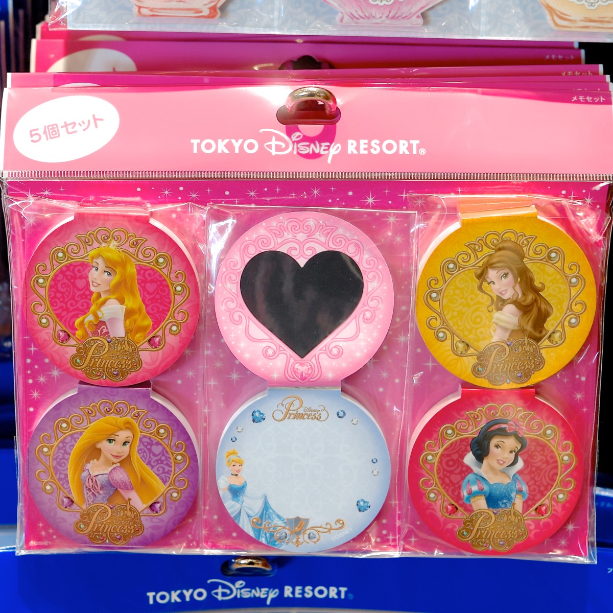 オーロラ、ラプンツェル、シンデレラ、ベル、白雪姫のコンパクトミラー風デザインメモ。