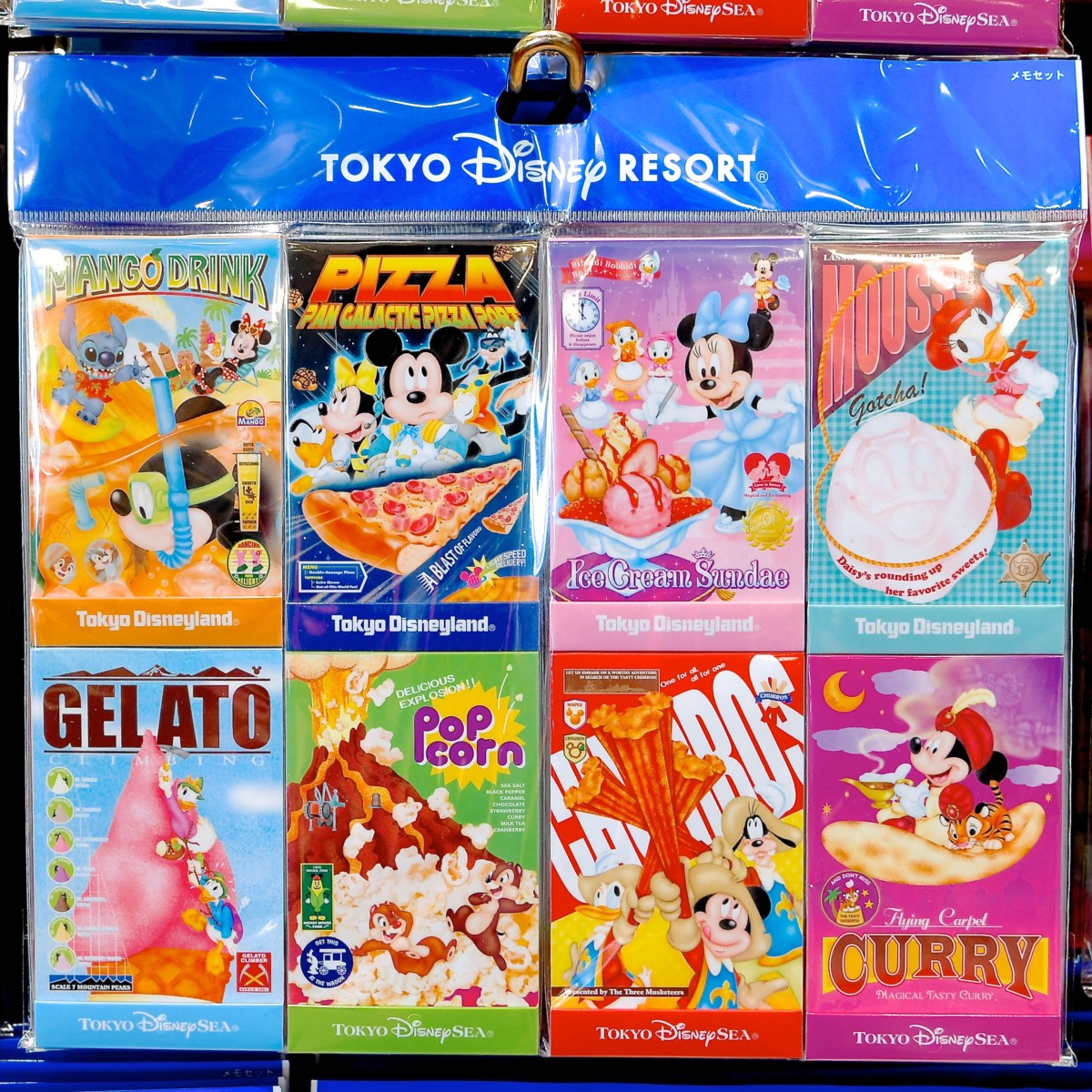 パン・ギャラクティック・ピザ・ポートのピザ、チュロス、ポップコーンなど東京ディズニーリゾートで販売されているパークフードのポスター風のメモ8冊セット。
