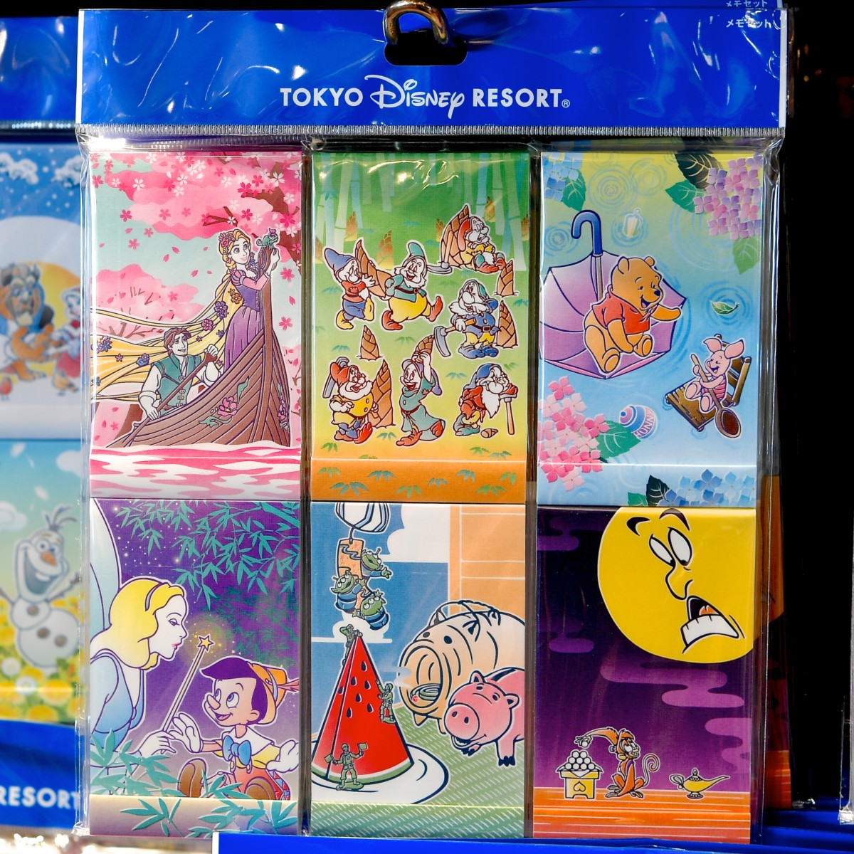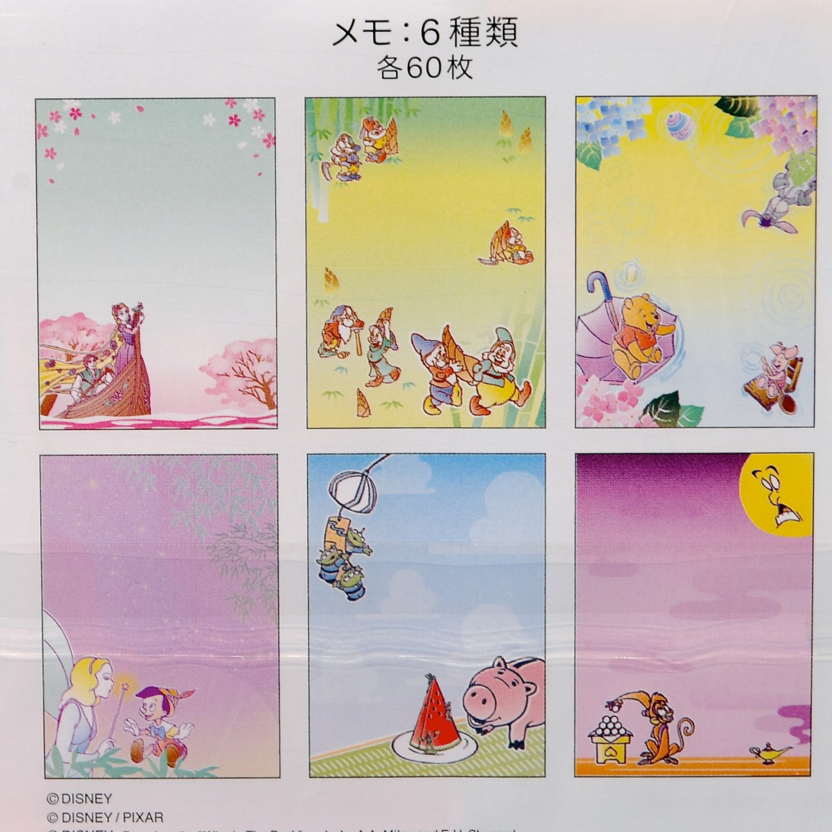 『塔の上のラプンツェル』、『白雪姫』、『くまのプーさん』、『ピノキオ』、『トイ・ストーリー』、『アラジン』の季節感あふれる和柄デザインメモセット。