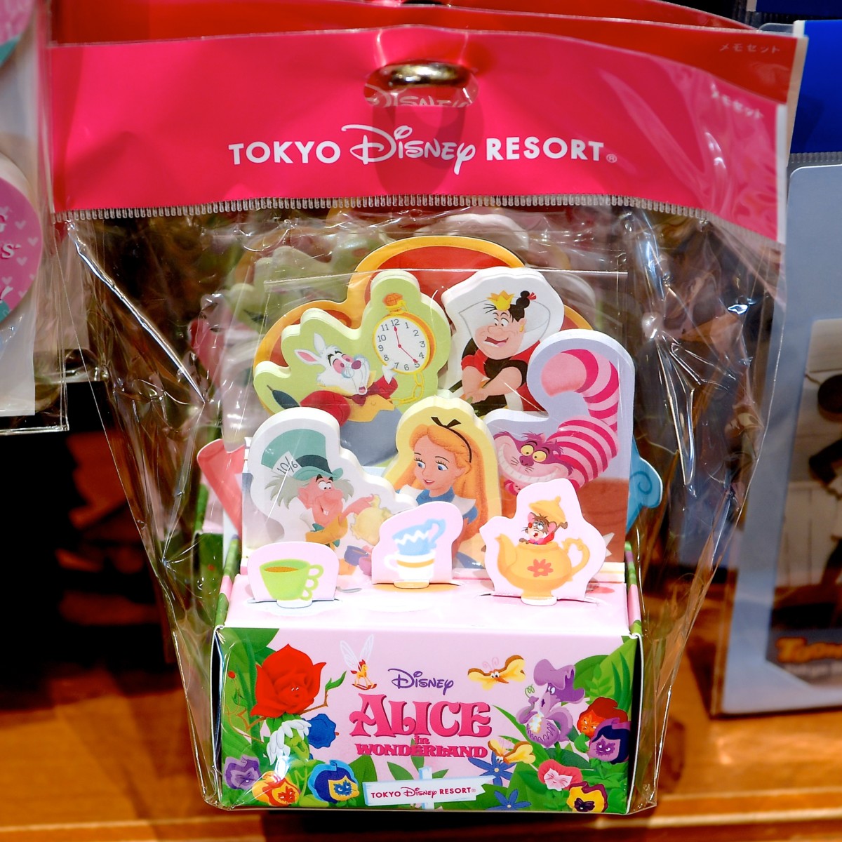 『ふしぎの国のアリス』のキャラクターたちがデザインされたケース入りメモ。