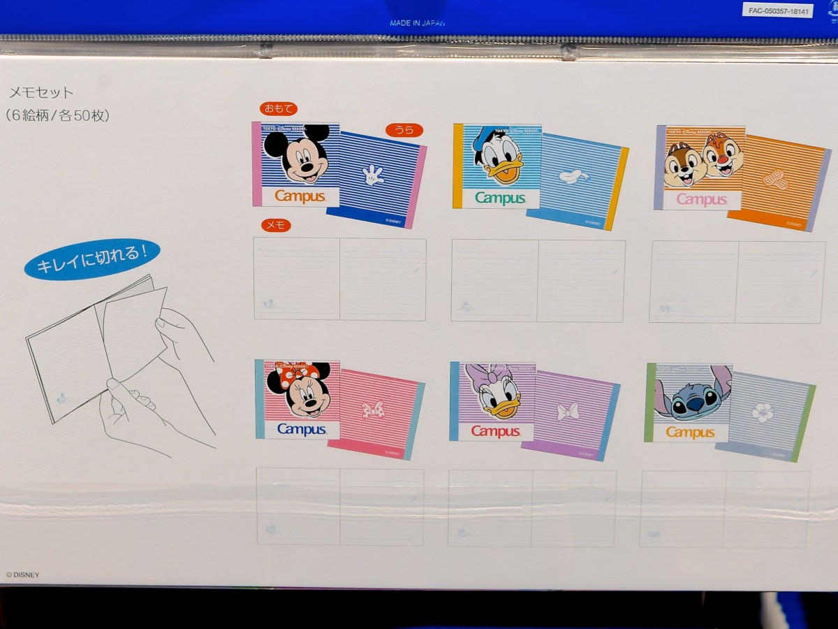 ミッキー、ミニー、ドナルド、デイジー、チップ&デール、スティッチのCampusノートデザインメモセット。