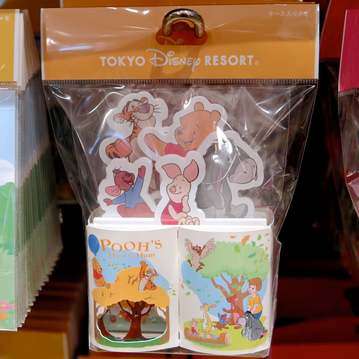 アトラクション『プーさんのハニーハント』モチーフのケースに入ったプーさん、ピグレット、イーヨー、ルー、ティガーのメモセット。