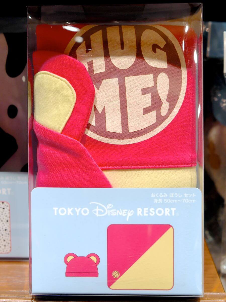 『トイ・ストーリー3』に登場する、抱きしめるといちごのにおいのするテディベア"ロッツォ"モチーフのおくるみと帽子のセット。