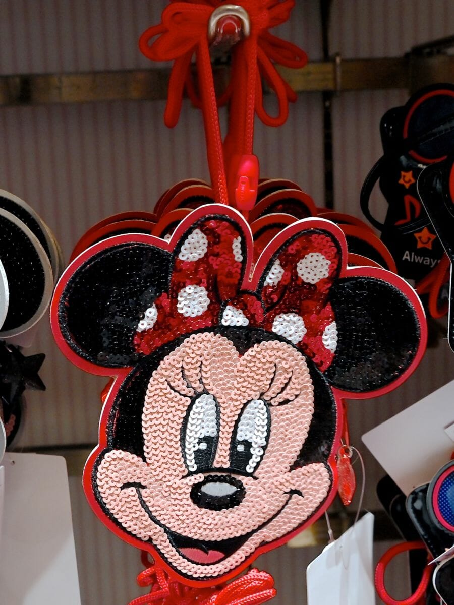 赤いドット柄リボンがかわいいミニーマウスのスパンコールパスケース。