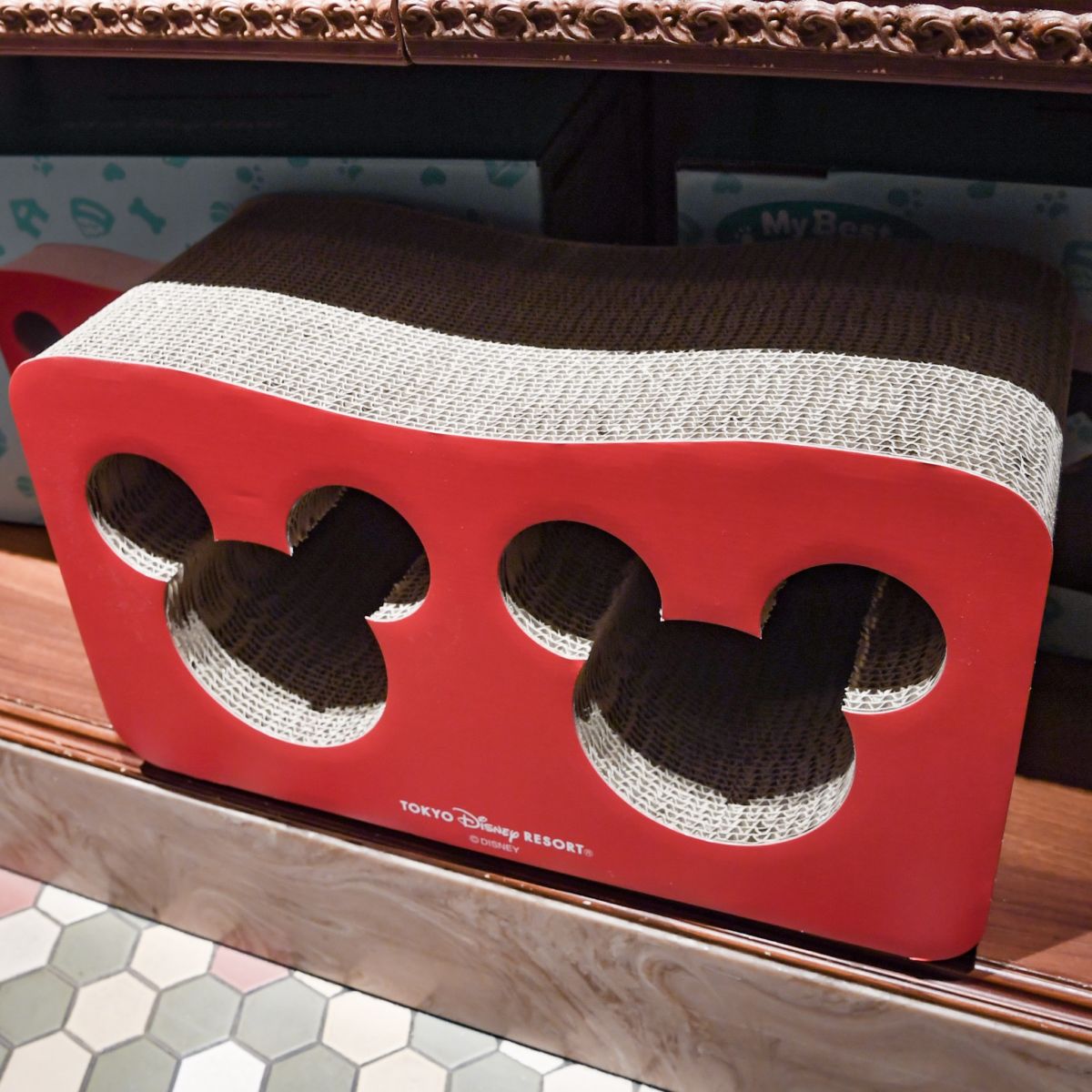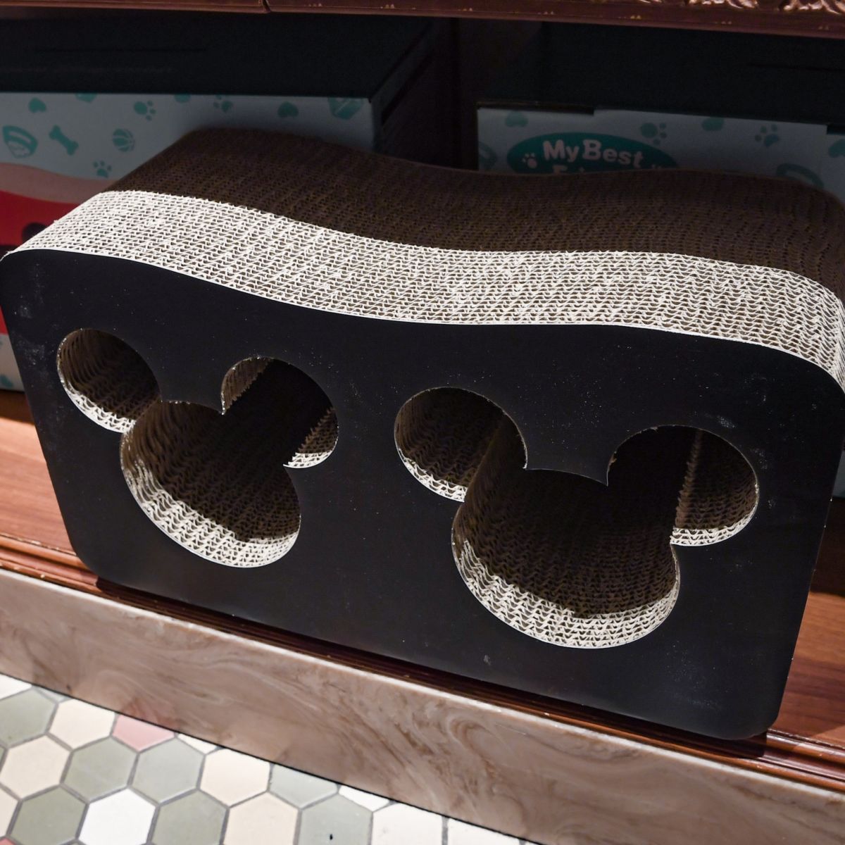 ミッキーシェイプがかわいいダンボール製の猫用爪とぎ。