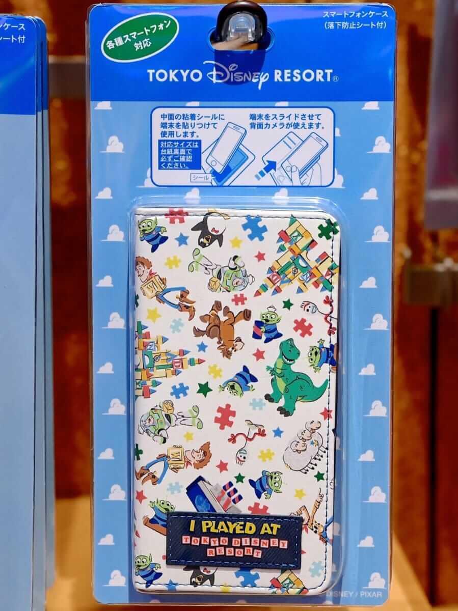 『トイ・ストーリー』の仲間たちとおもちゃでつくった東京ディズニーリゾートがデザインされた手帳型スマホケース。