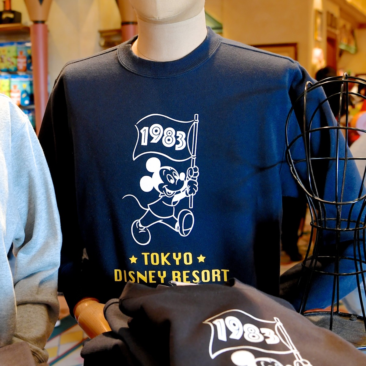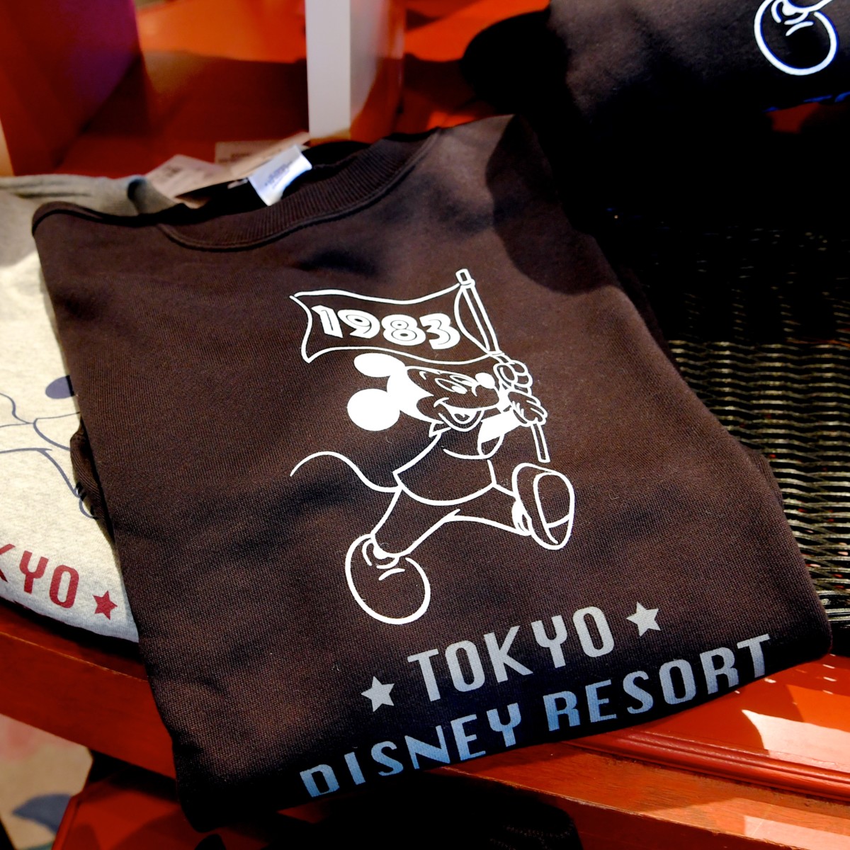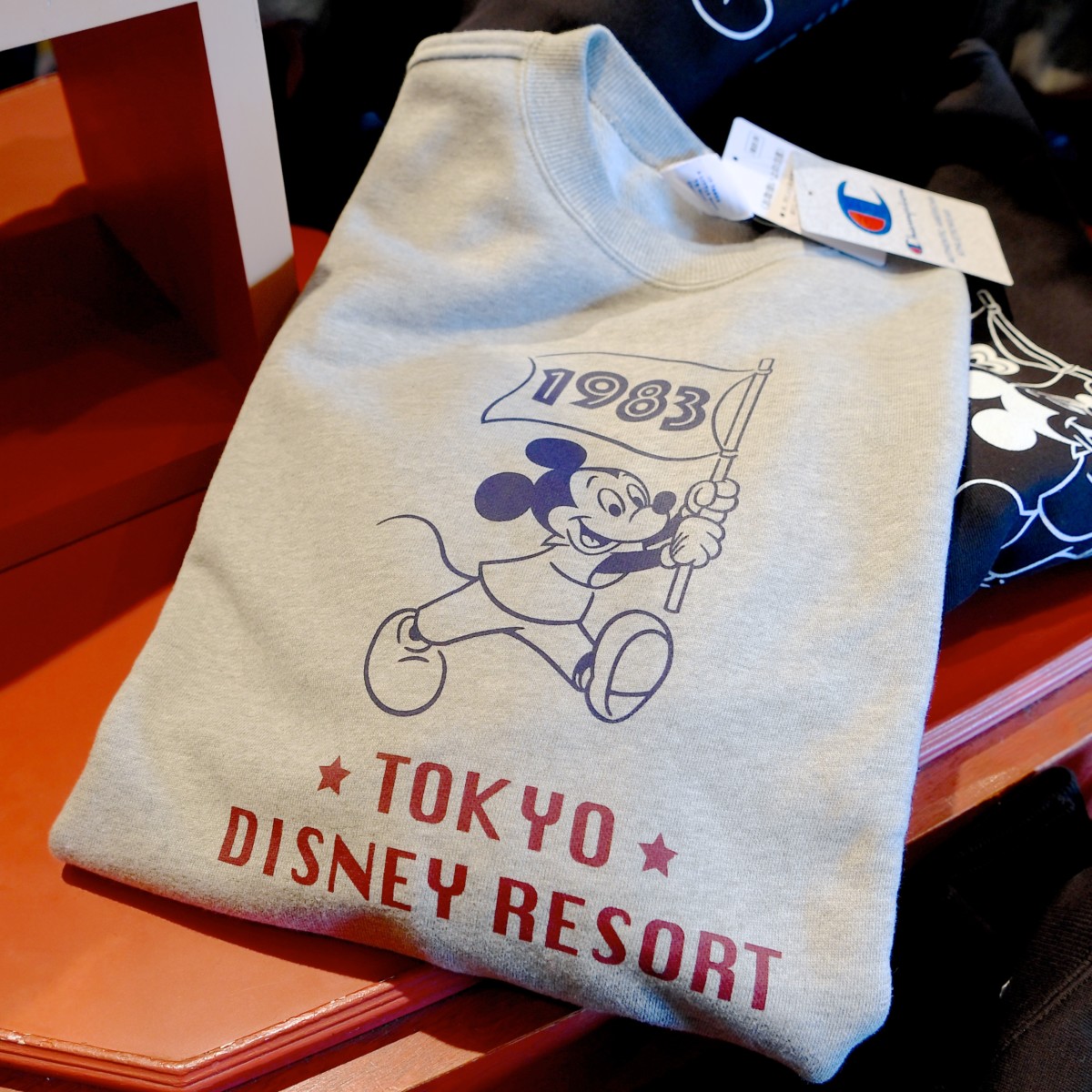 1983年の数字がデザインされたフラッグを振るかわいいミッキーと東京ディズニーリゾートの文字がデザインされたシンプルかわいいトレーナー☆