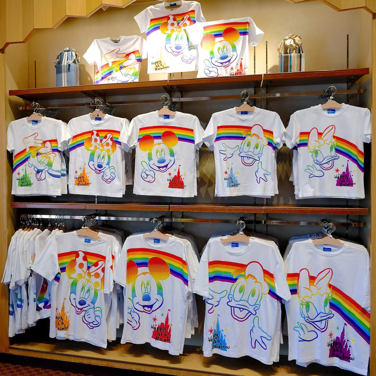 ミッキー、ミニー、ドナルド、デイジー、グーフィーのレインボーデザインTシャツ。