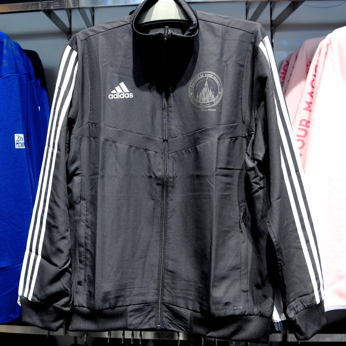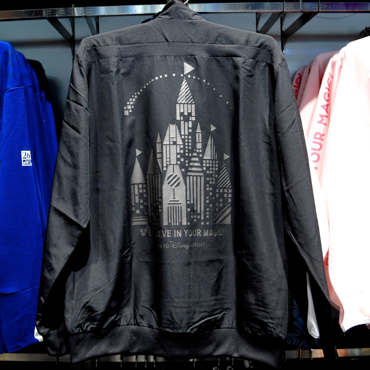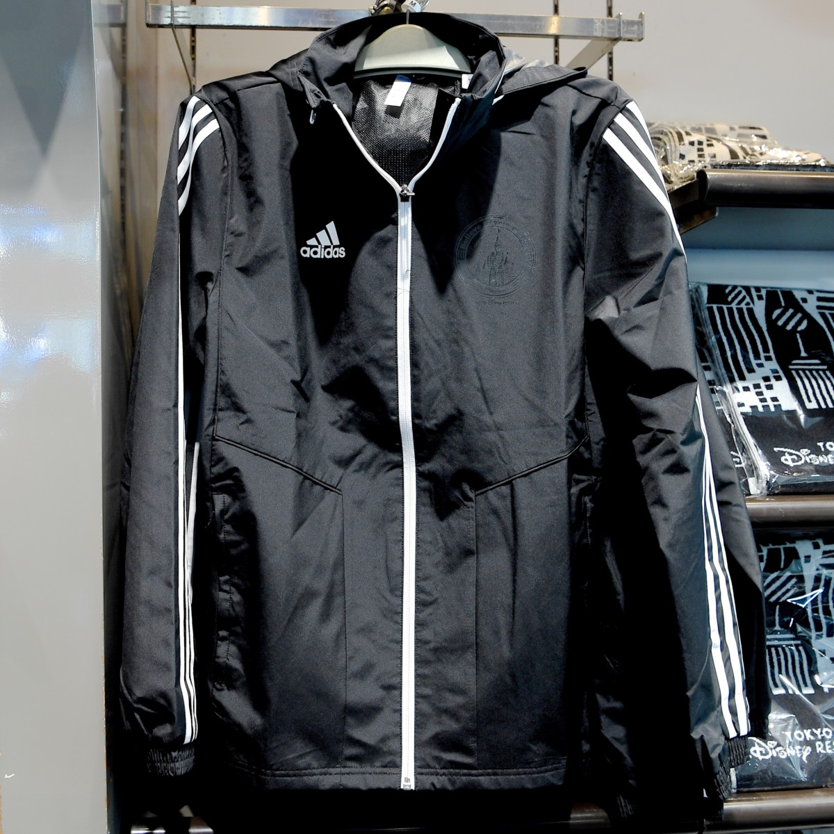 東京ディズニーランドのシンボル、シンデレラ城と東京ディズニーシーのシンボル、プロメテウス火山、ミッキー&フレンズがデザインされたTeam Disneyパーカー。