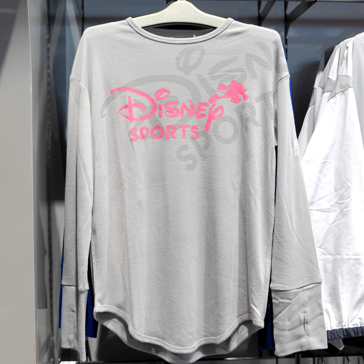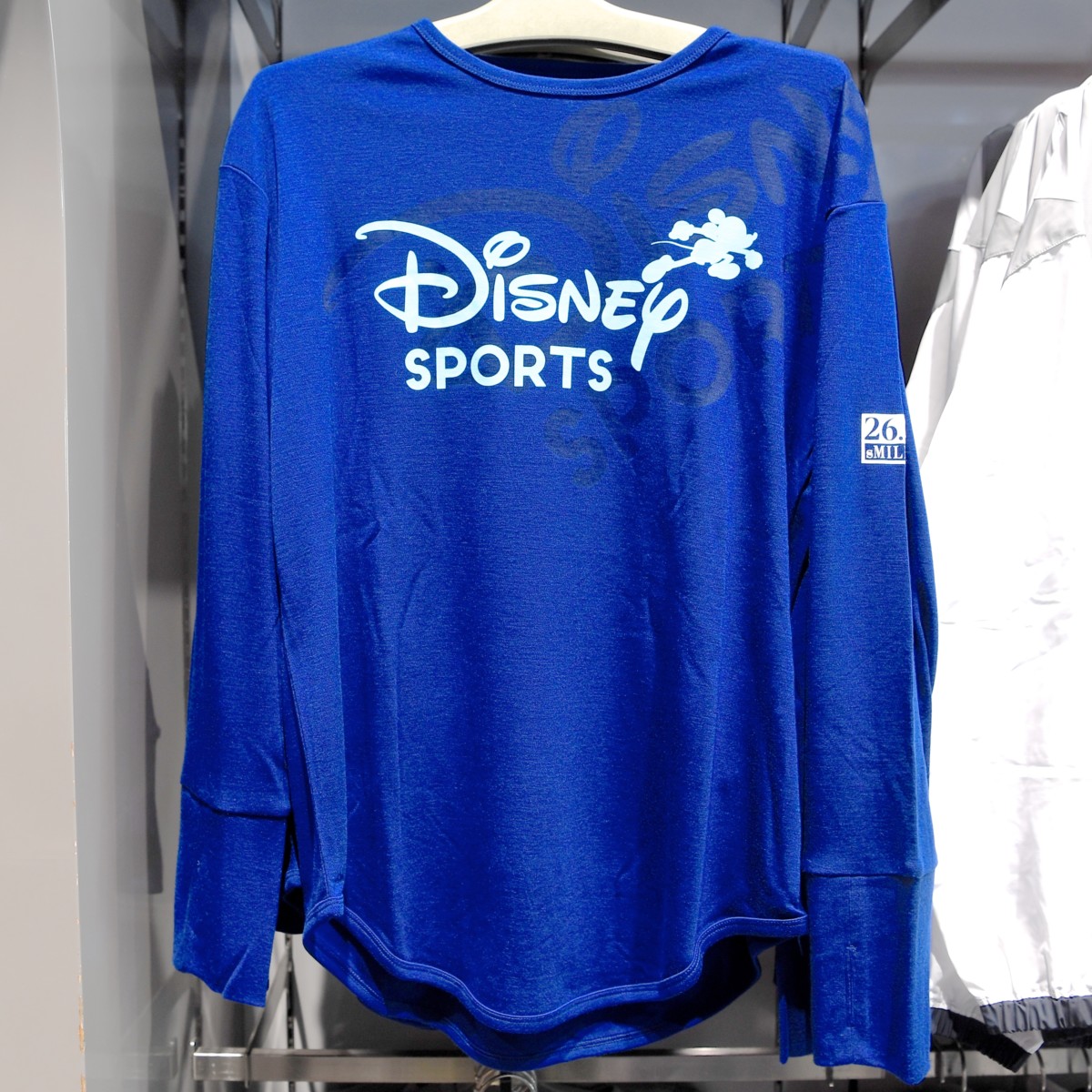 ミッキーマウスの名前が腕にデザインされたロングTシャツ。