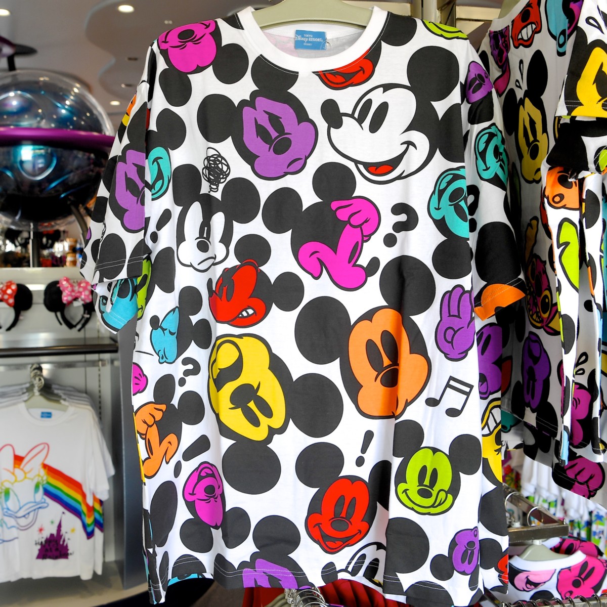 ミッキーのお顔がカラフルにデザインされた定番総柄Tシャツ。