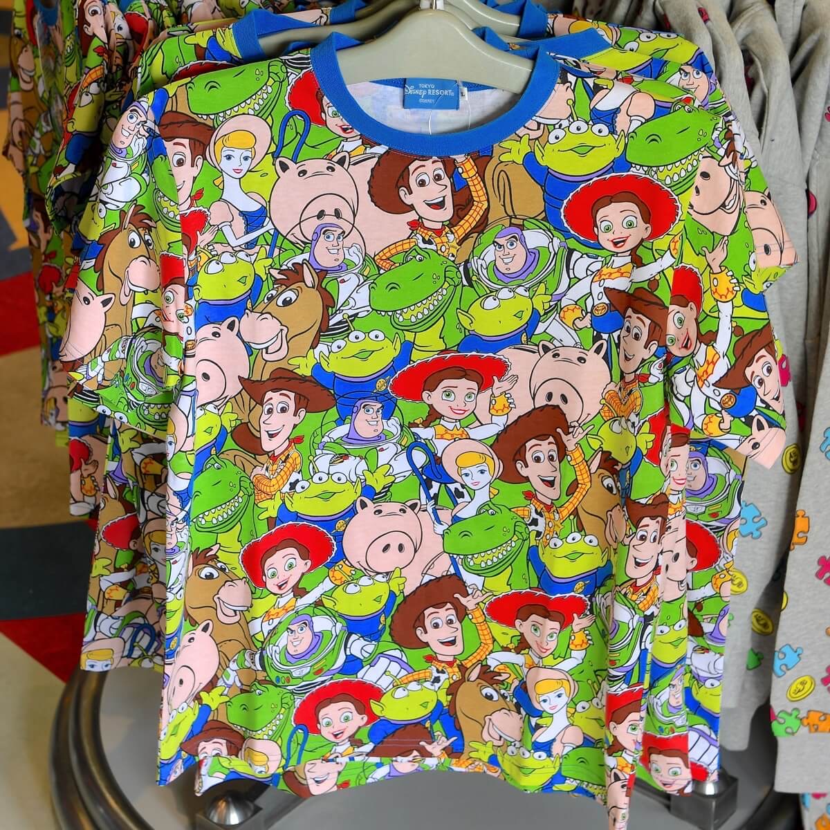 『トイ・ストーリー』の総柄Tシャツには、ウッディ、バズ・ライトイヤー、ジェシー、ブルズアイ、レックス、リトルグリーンメン、ハム、ボー・ピープがデザインされています。