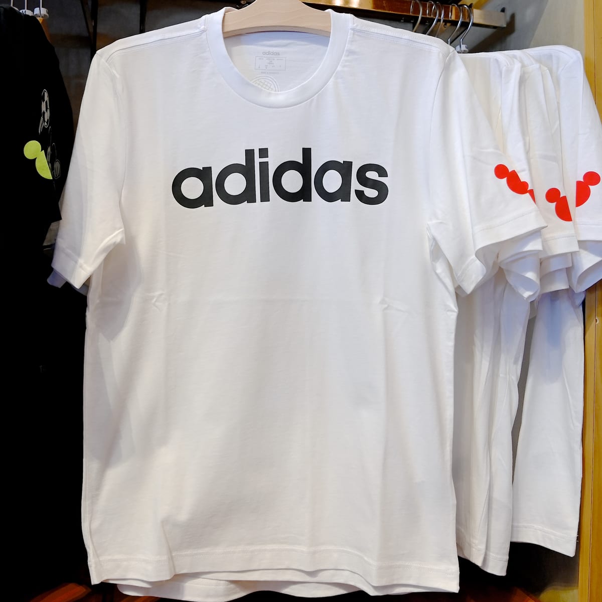 adidasデザインの白Tシャツ。