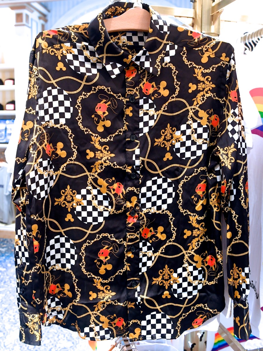 ブラックにゴールドが映えるミッキーマウスデザインの長袖シャツ。