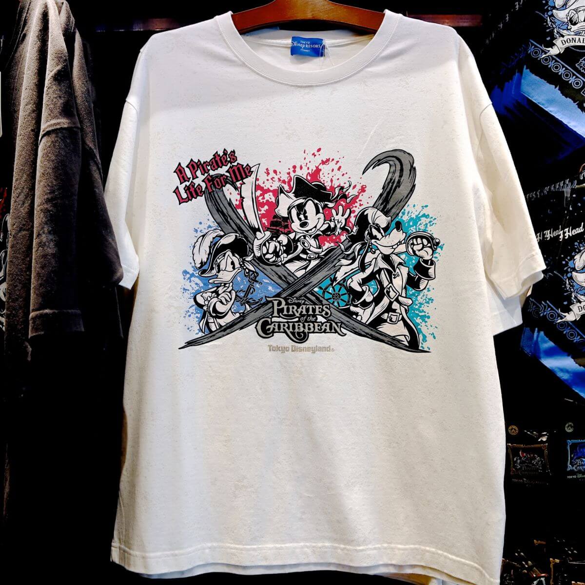 海賊コスチュームのミッキーマウス、ドナルドダック、グーフィーがデザインされたTシャツ。