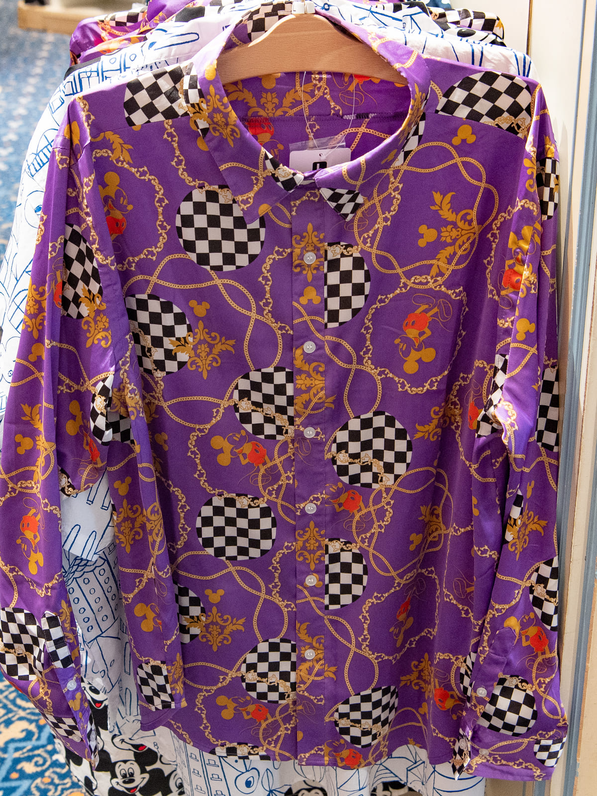 ミッキーマウスとチェーン柄、チェック柄など組み合わせがカラフルな長袖シャツ。