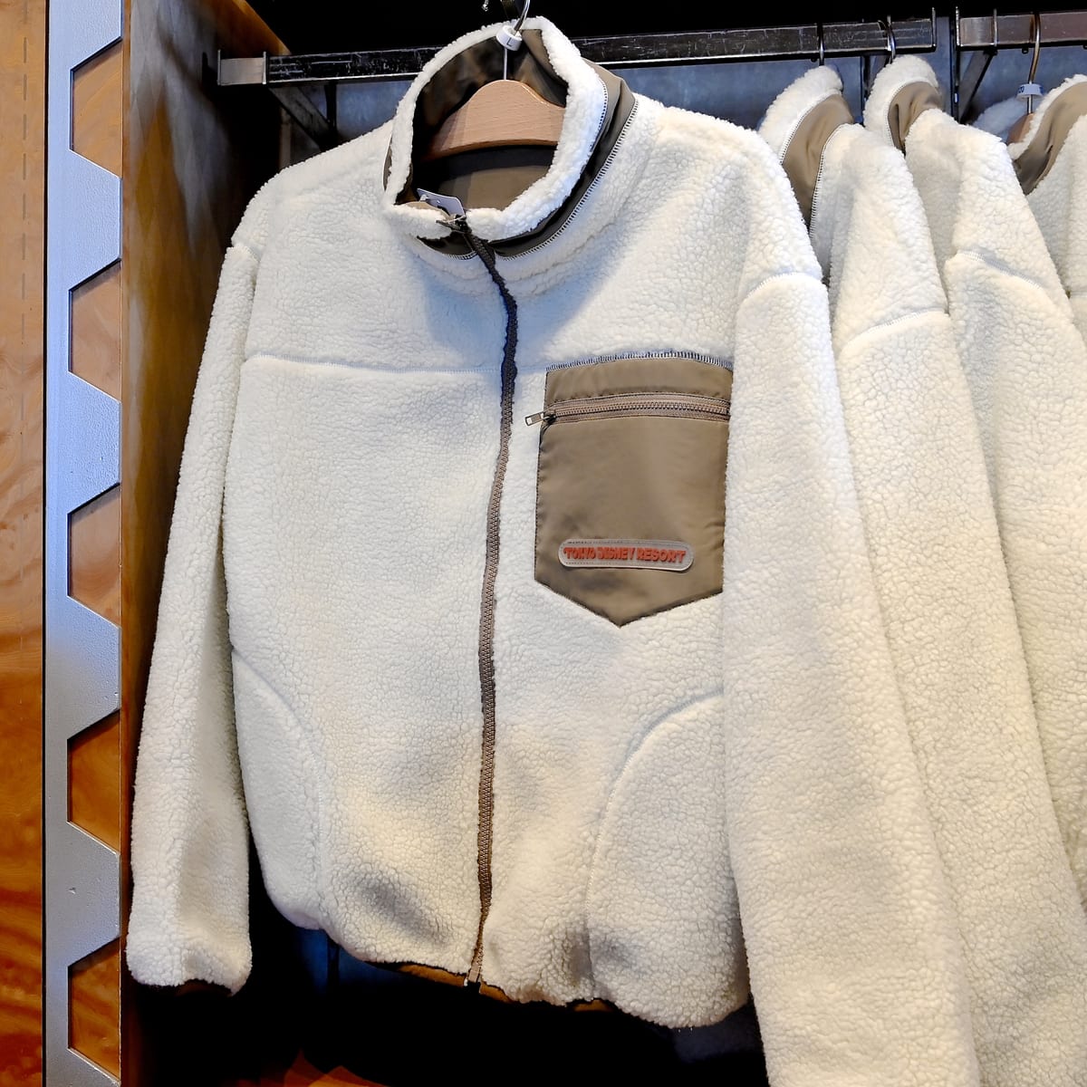 リサイクル素材を原材料としたベージュカラーのふわもこアウター。