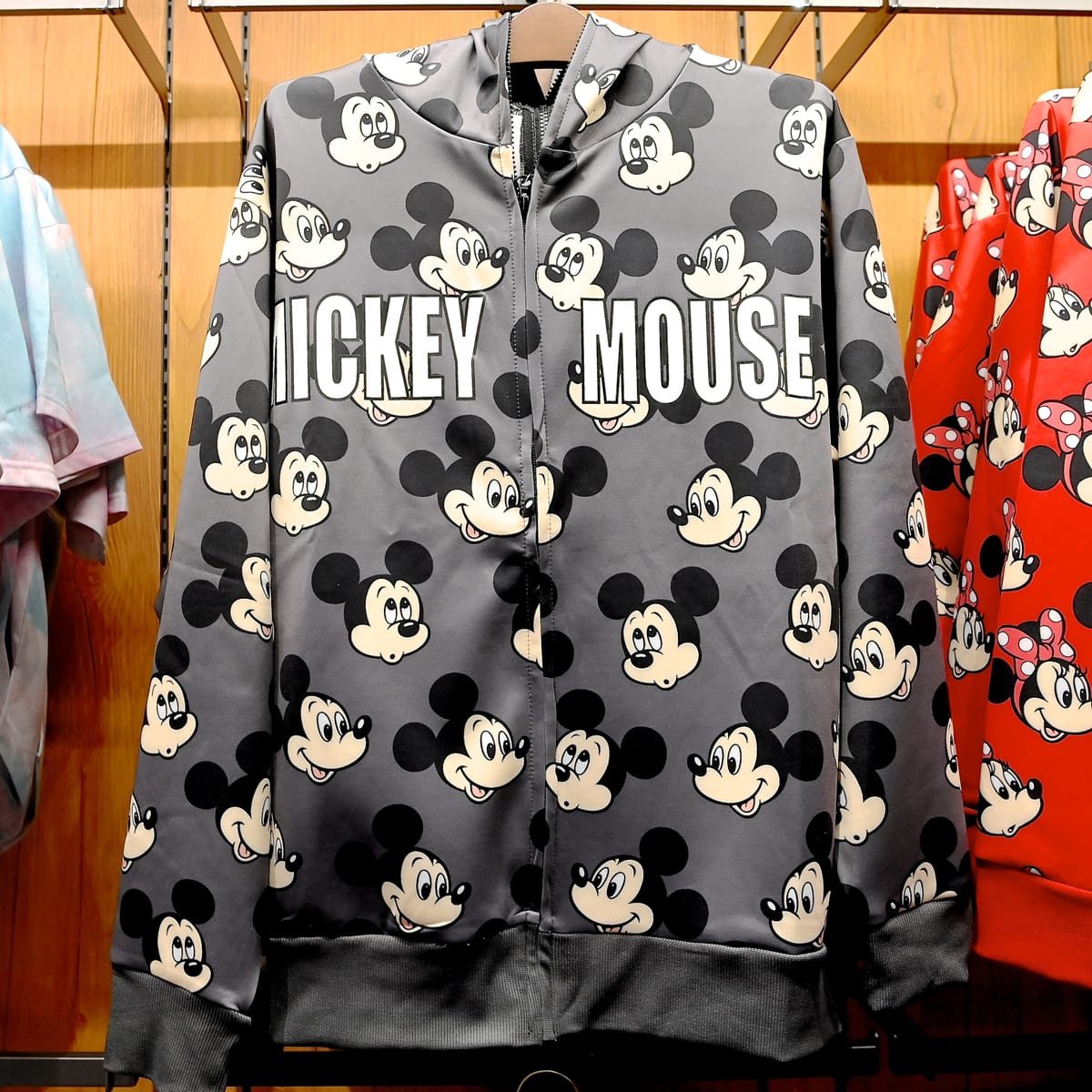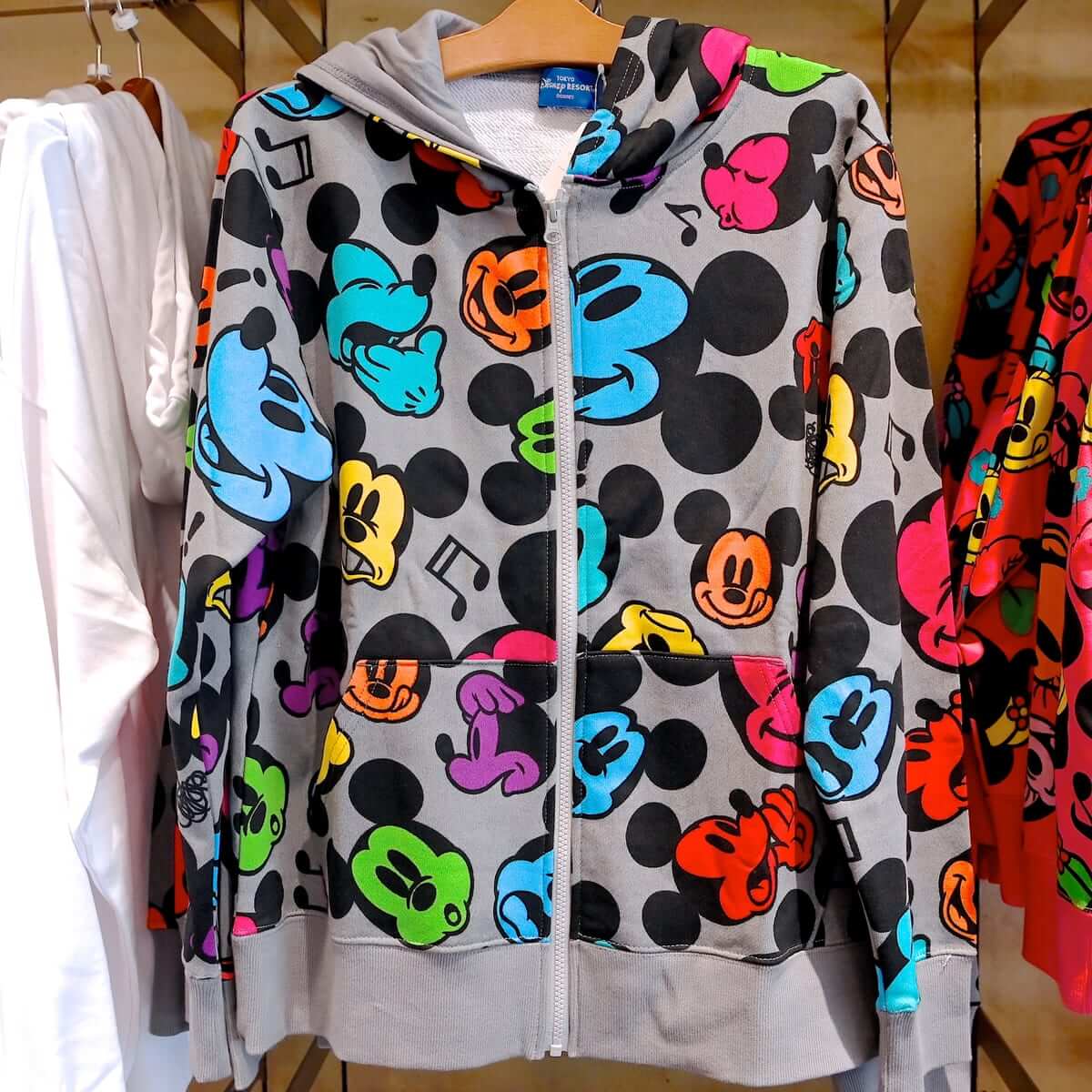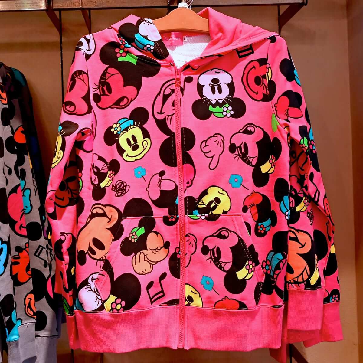 定番、表情違いのミッキーマウスがカラフルにデザインされた総柄パーカー。