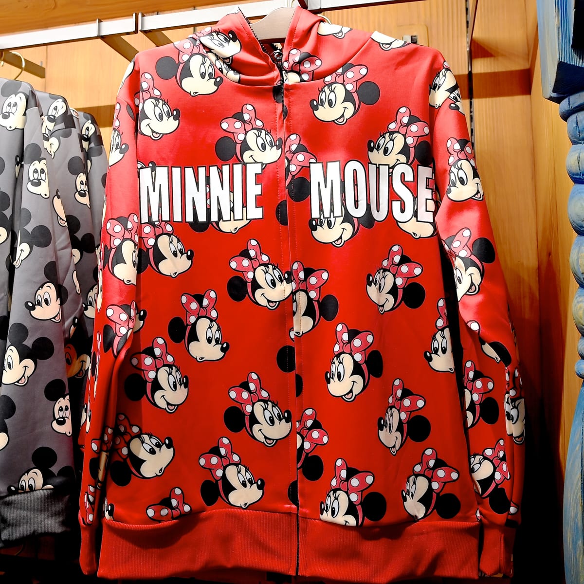 定番、カラフルなミニーマウスのお顔総柄パーカー。