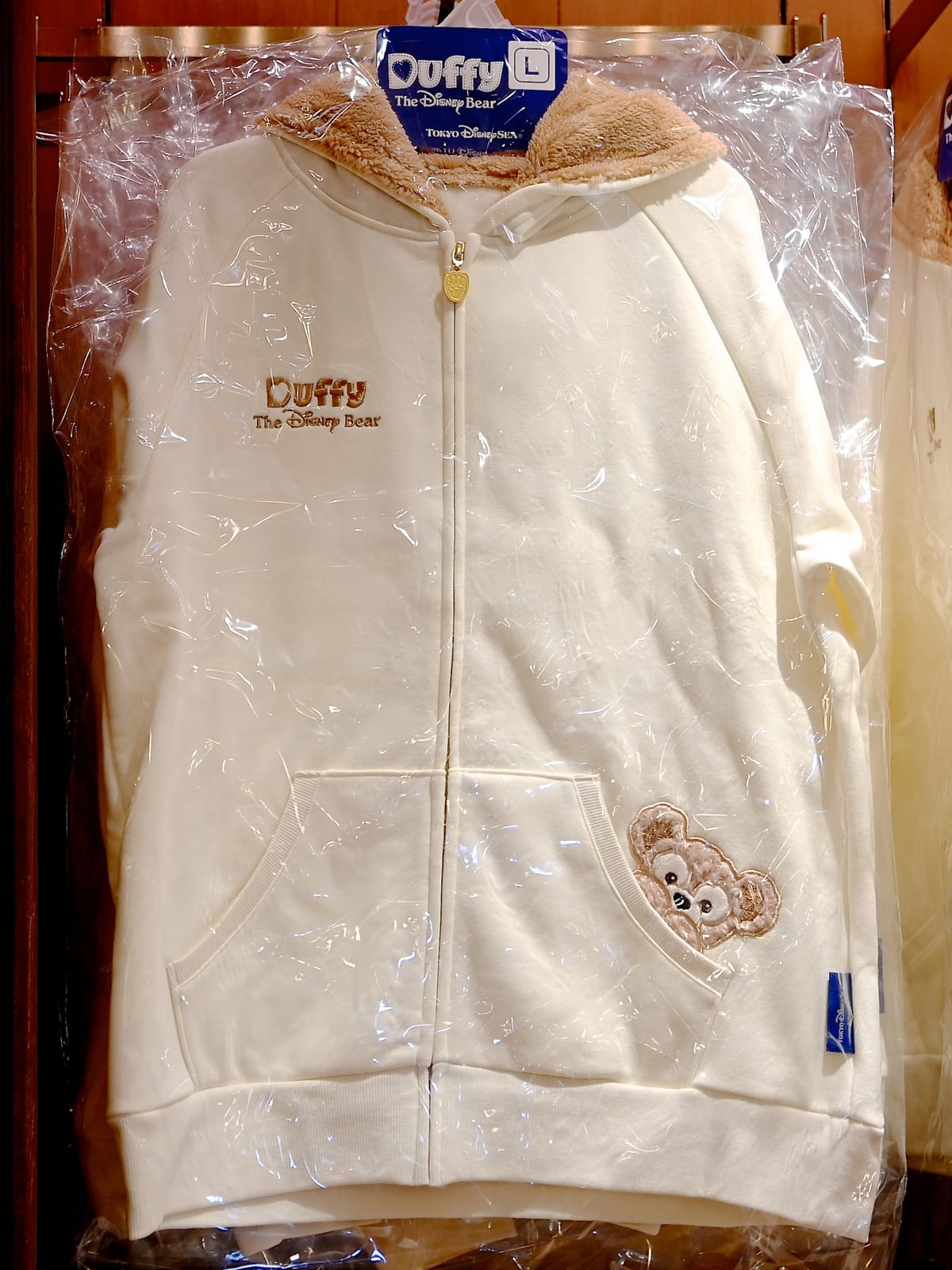 ポケットから覗くふわもこダッフィーがかわいいホワイトカラーのパーカー。