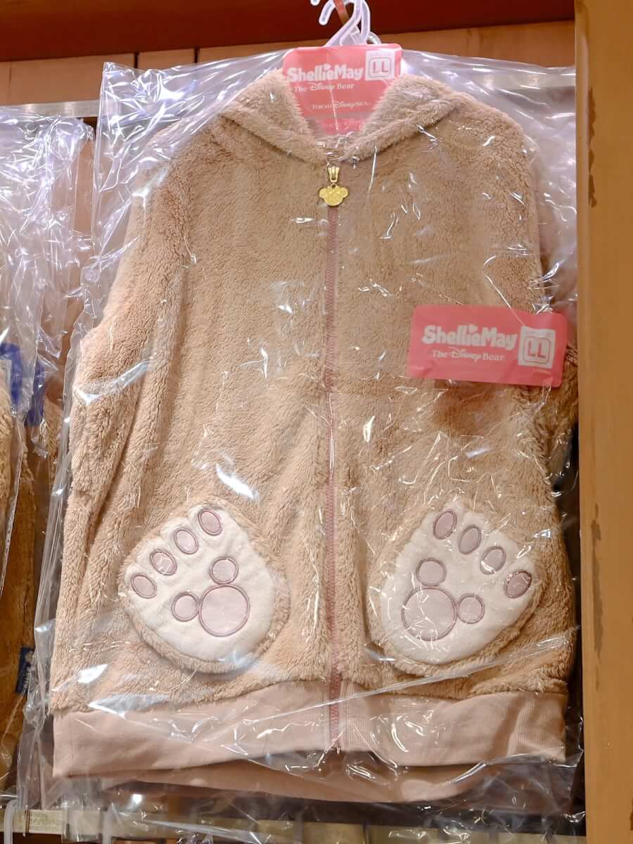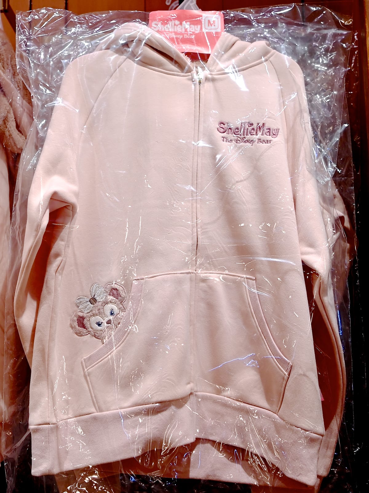フードにリボンとお耳、肘部分にピンクのダッフィーマーク、背中にしっぽとピンクのミッキーマークが付いています。