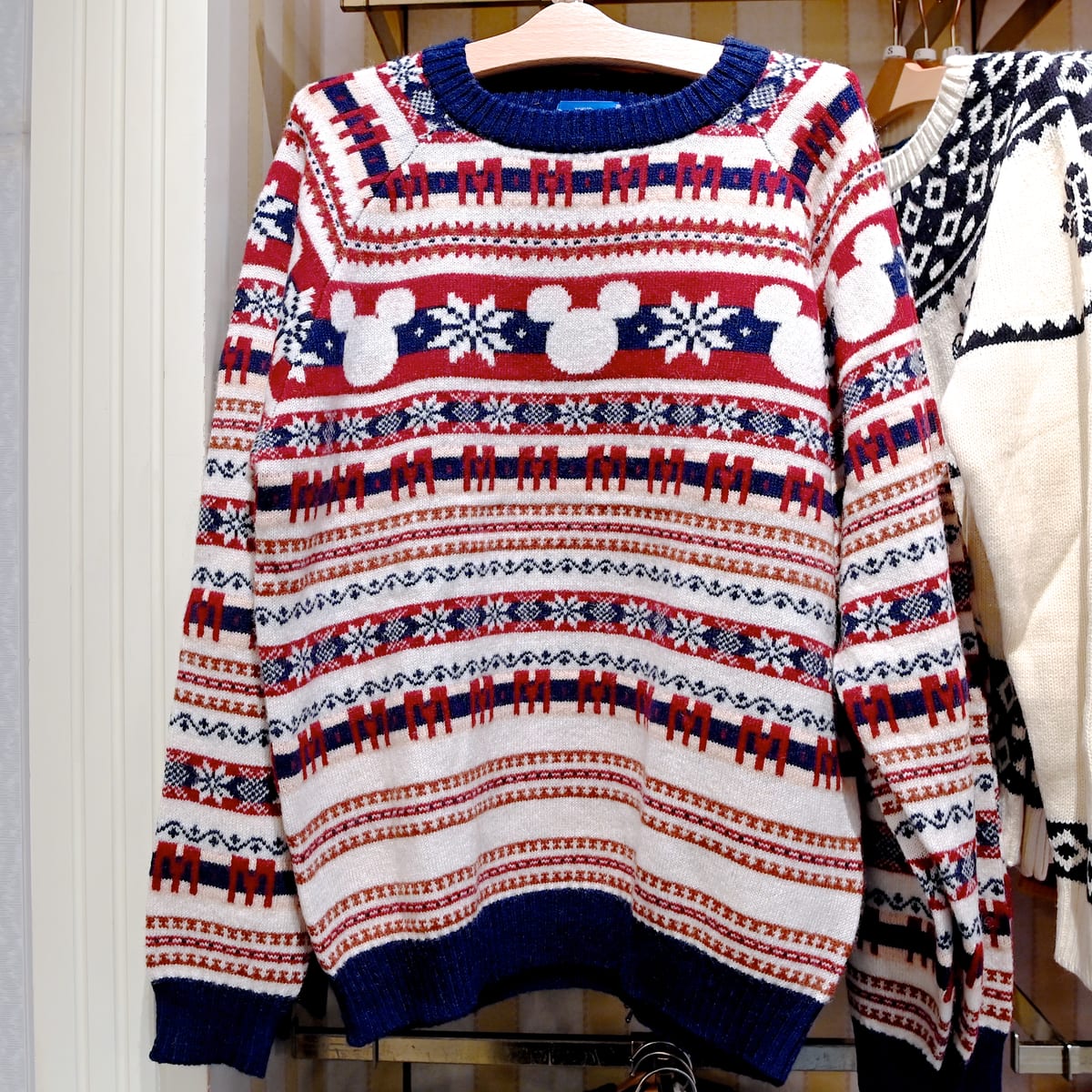 お散歩するミッキーマウスがデザインされたホワイト×ネイビーのセーター。