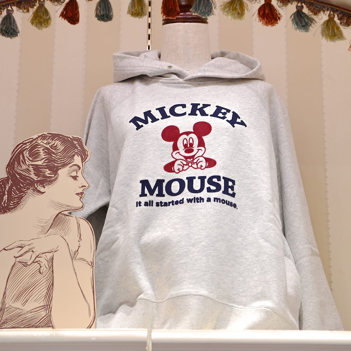 蝶ネクタイを持ちポーズをとるミッキーマウスとMICKEY MOUSEの名前がデザインされたグレーパーカー。