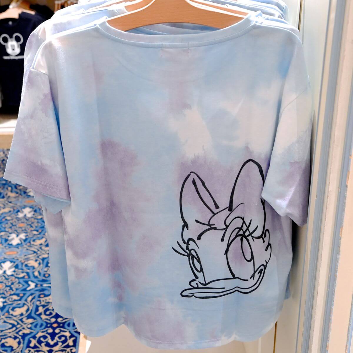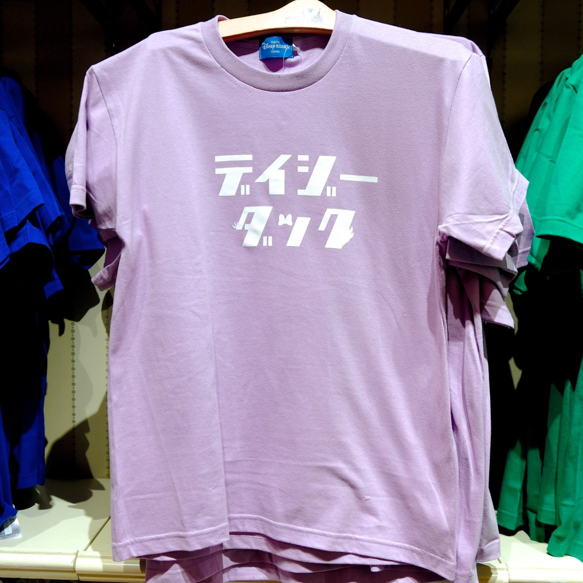 中央にデイジーダックとデザインされた淡い紫色のTシャツ。
