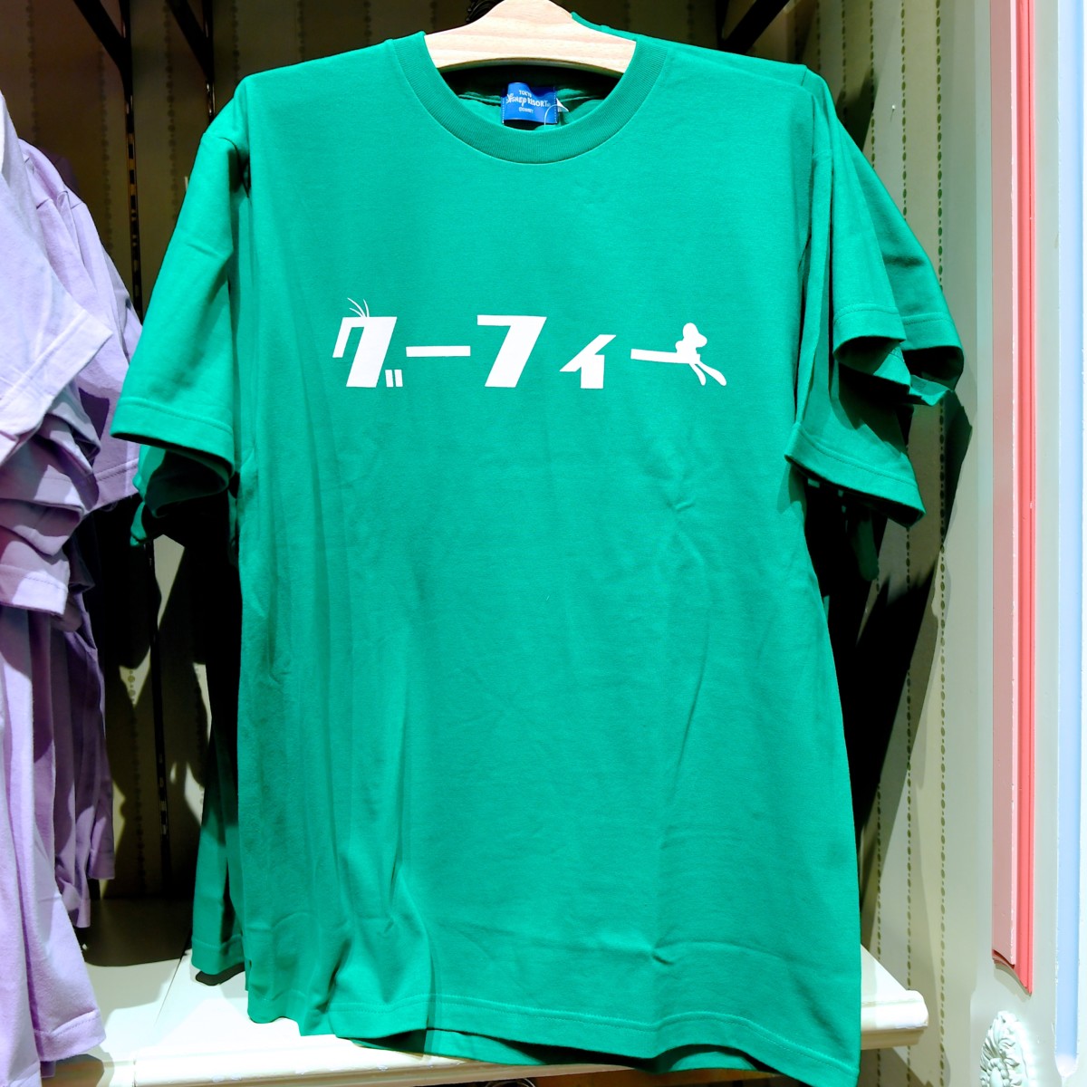 中央にグーフィーとデザインされた緑色のTシャツ。