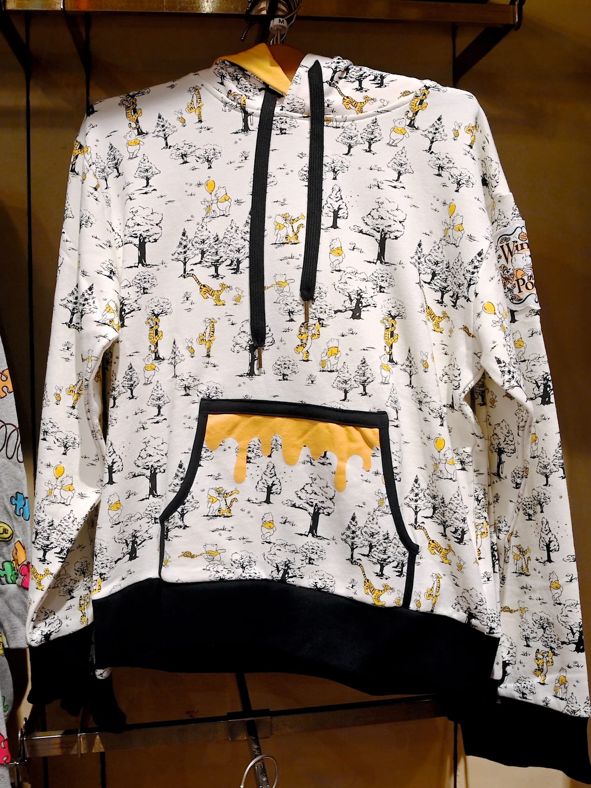 100エーカーの森で遊ぶプーさん、ティガー、ピグレットがデザインされたパーカー。