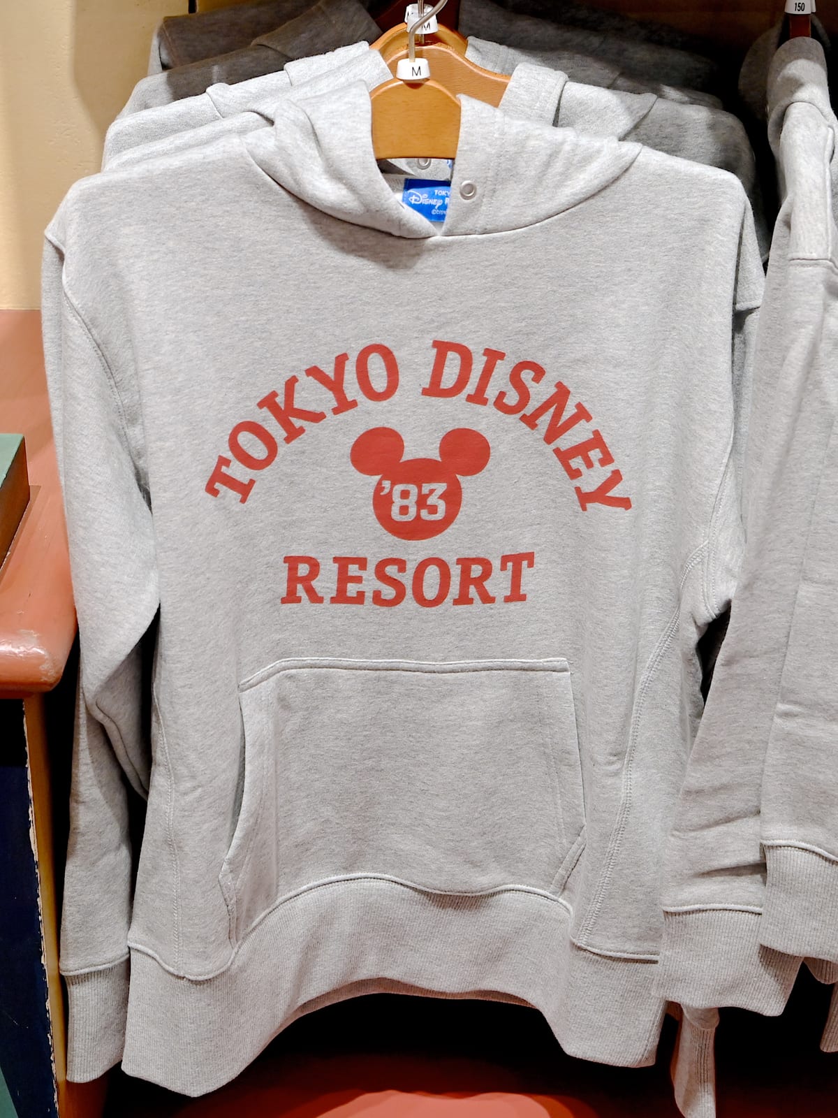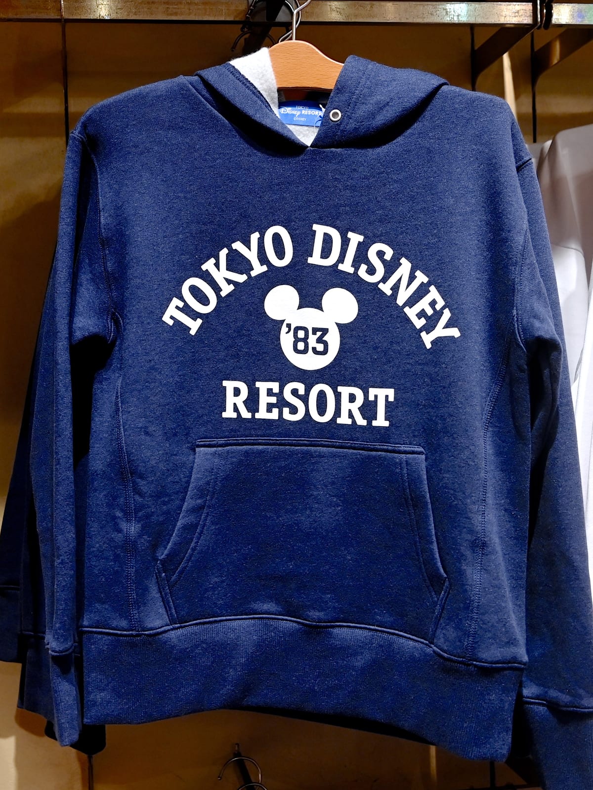 中央に東京ディズニーリゾートのロゴとミッキーマーク、開園年の1983の83がデザインされたシンプルパーカー。