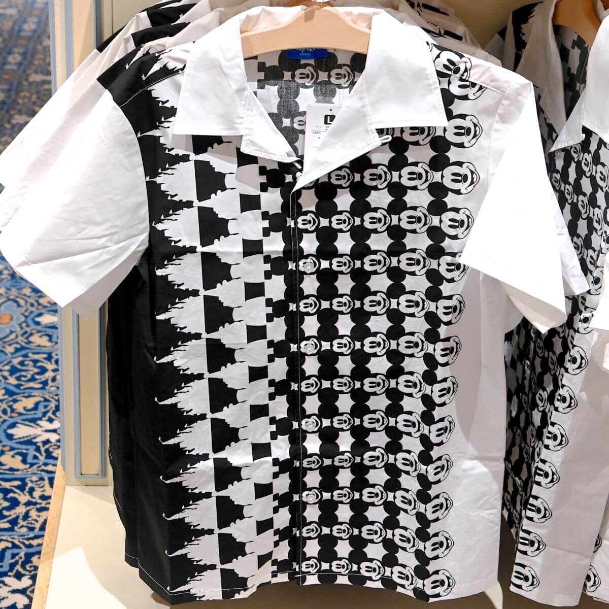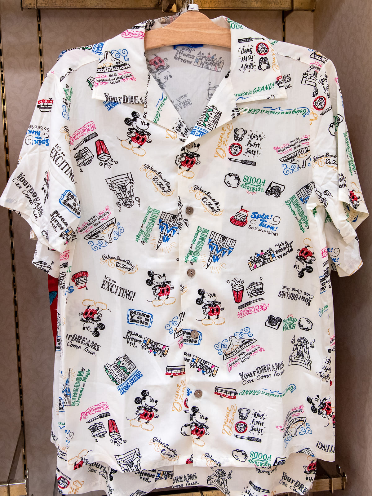 「ミッキーマウス」とパークの風景やアトラクション、パークフードがデザインされたアロハシャツ。