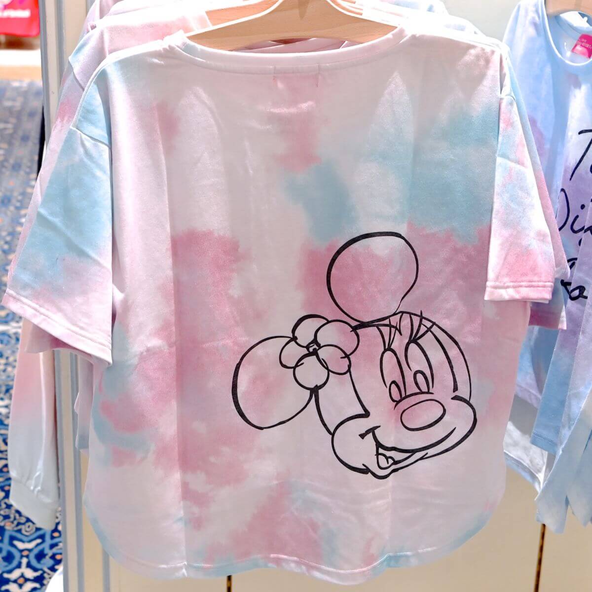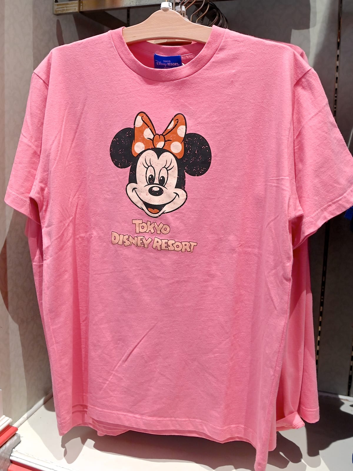 中央にミニーマウスとデザインされたピンク色Tシャツ。