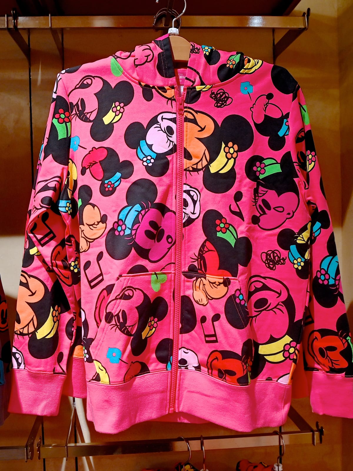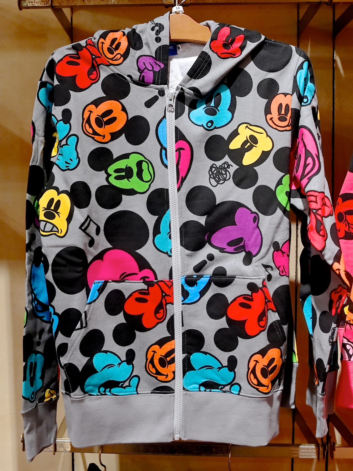 表情違いのミッキーマウスがカラフルにデザインされた総柄パーカー。
