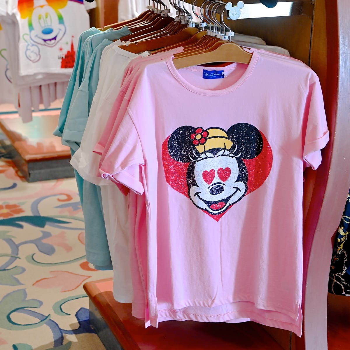 お目々をハートにしたミニーマウスのお顔がデザインされたTシャツ。