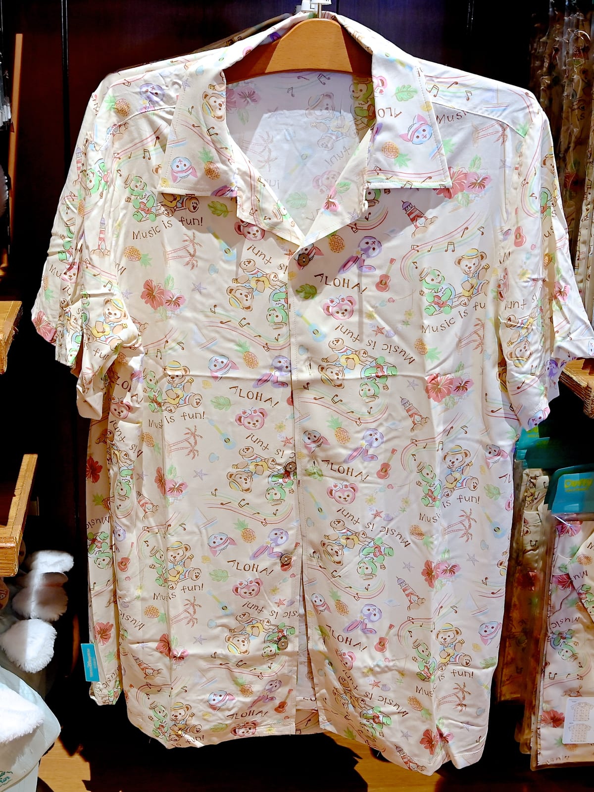 音楽が大好きなカメの男の子「オル・メル」と一緒に楽器の演奏や夏を楽しむダッフィーたちがデザインされたアロハシャツ。