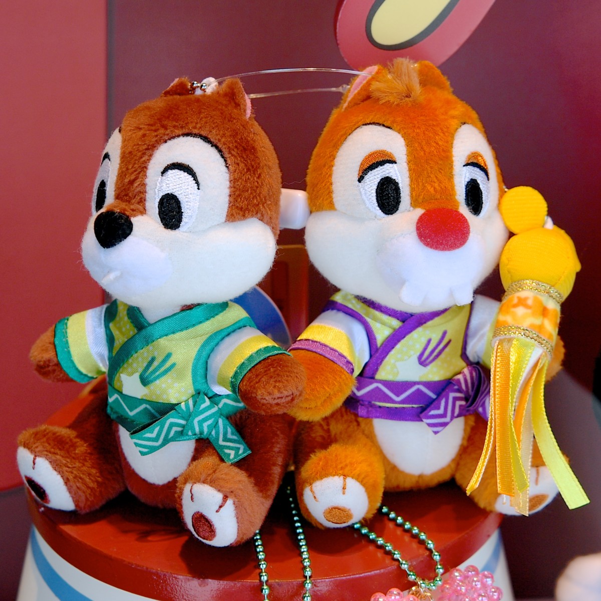 おそろいの黄色い和装コスチュームを着たチップ&デールぬいぐるみバッジセット。