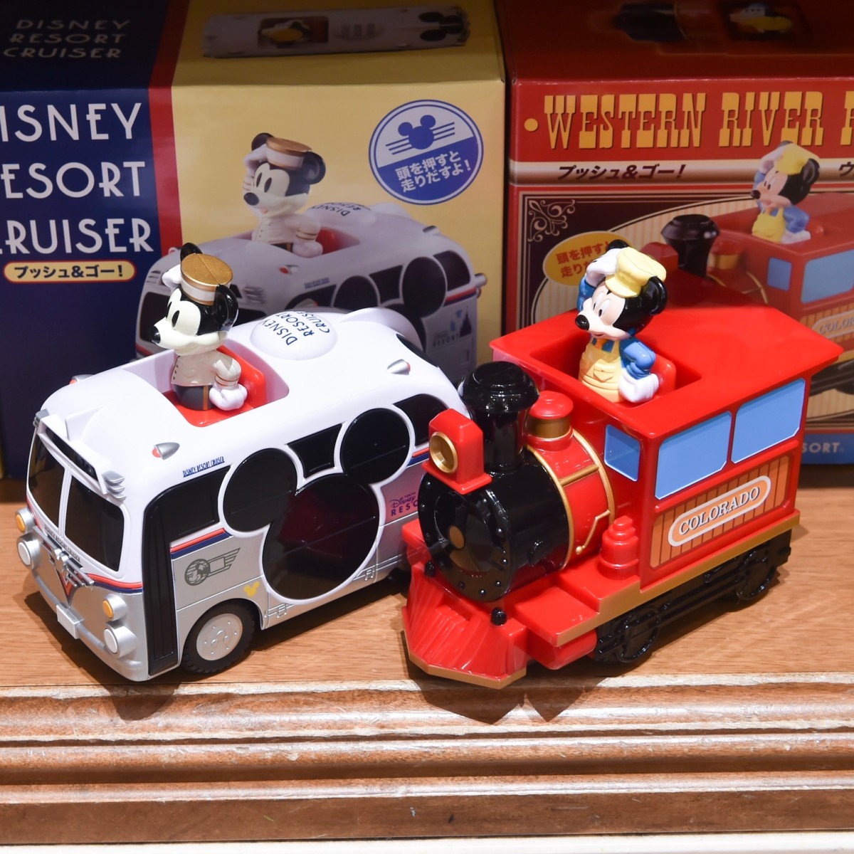 東京ディズニーランド、東京ディズニーシーとホテルを結ぶバス「ディズニーリゾートクルーザー」と東京ディズニーランドのアトラクション「ウエスタンリバー鉄道」のおもちゃ。