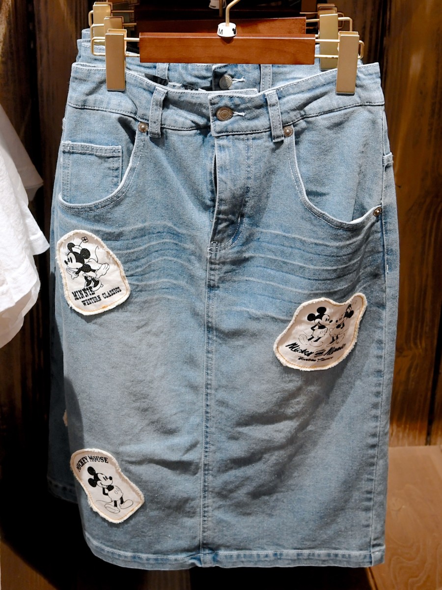クラシックなミッキー、ミニーがデザインされたワッペンがかわいいデニムスカート。