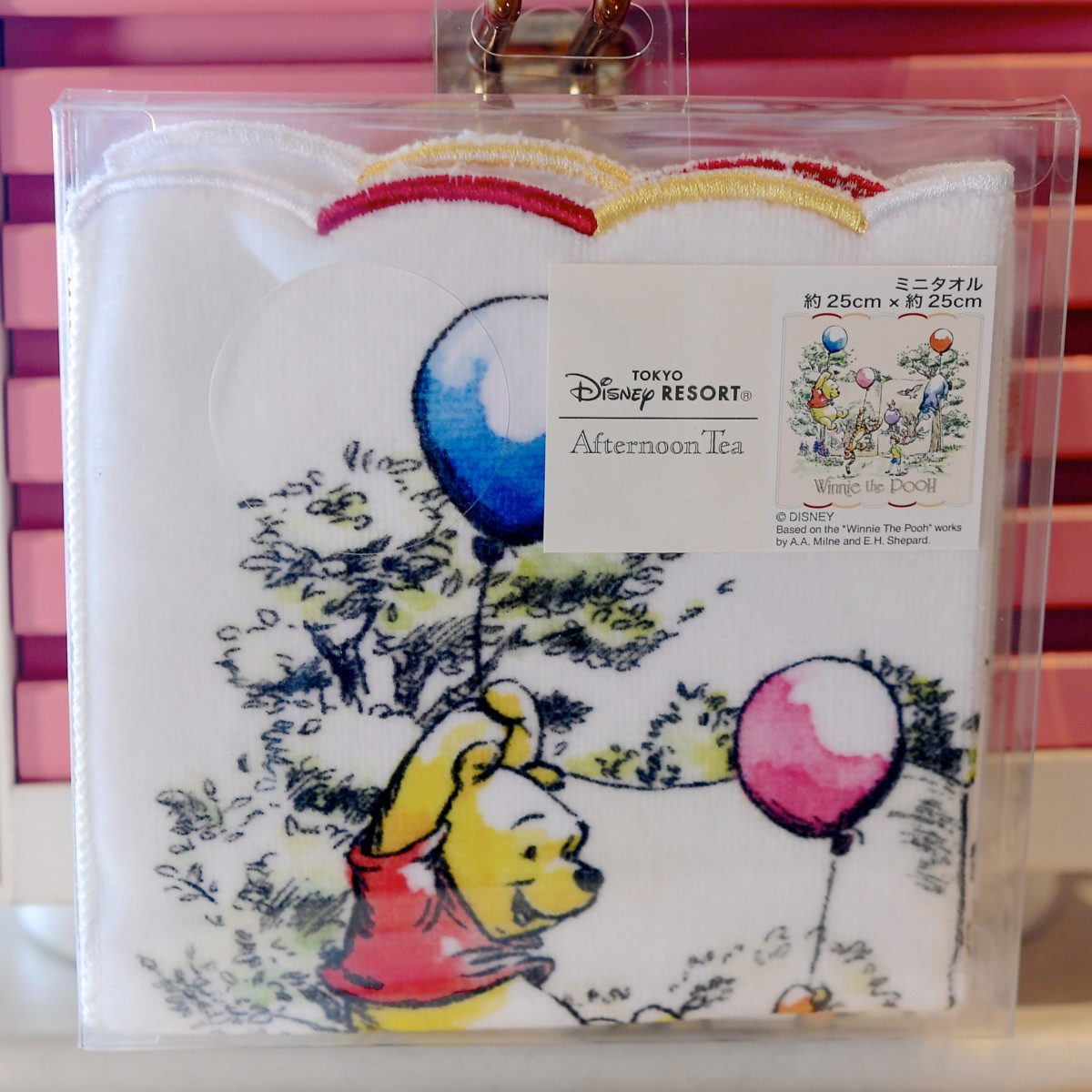 東京ディズニーランドのアトラクション「プーさんのハニーハント」の世界観の中に風船で浮かぶくまのプーさん、ティガー、ピグレット、イーヨー、そしてその様子を楽しそうに見ているクリストファー・ロビンがデザインされたミニタオル。