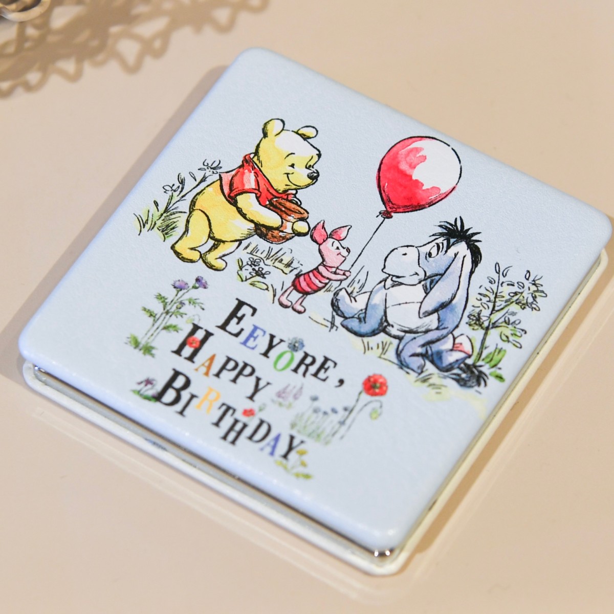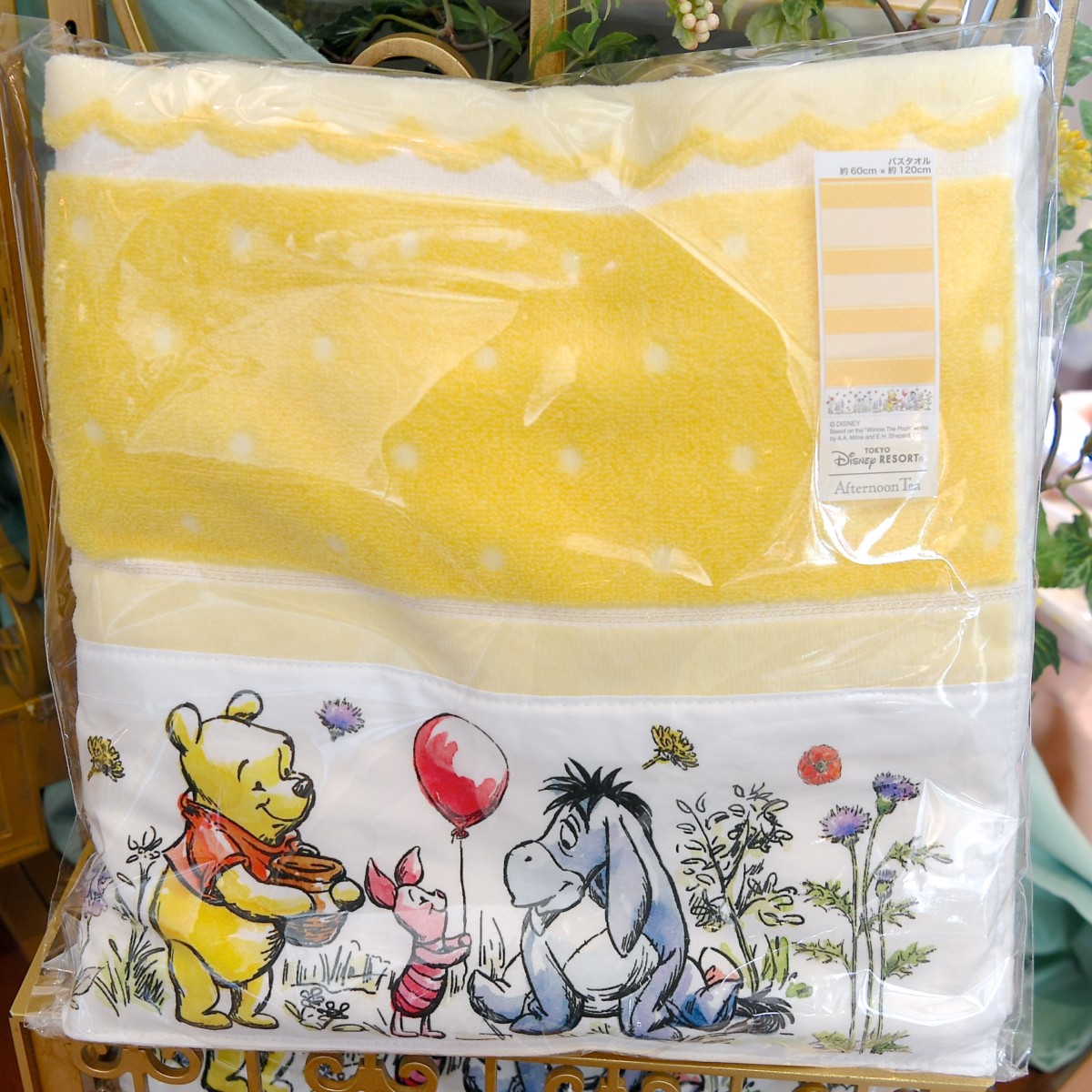 はちみつカラーがかわいいミニタオルにはイーヨーのお誕生日をお祝いするプーさんとピグレットがデザインされています。