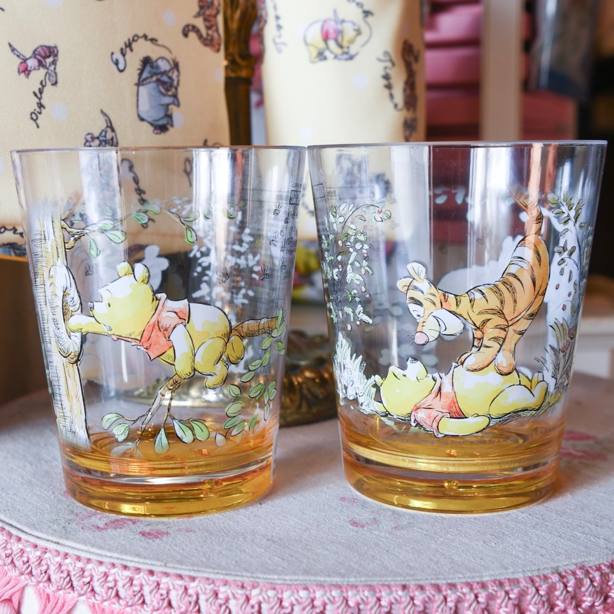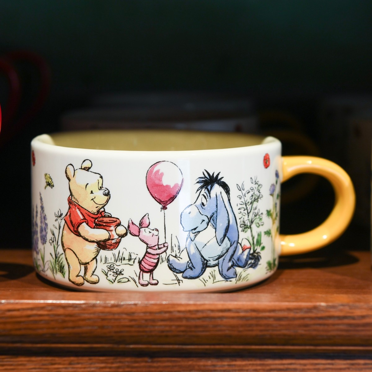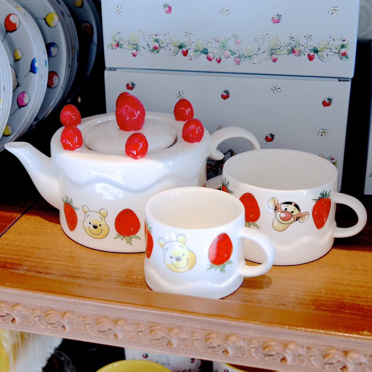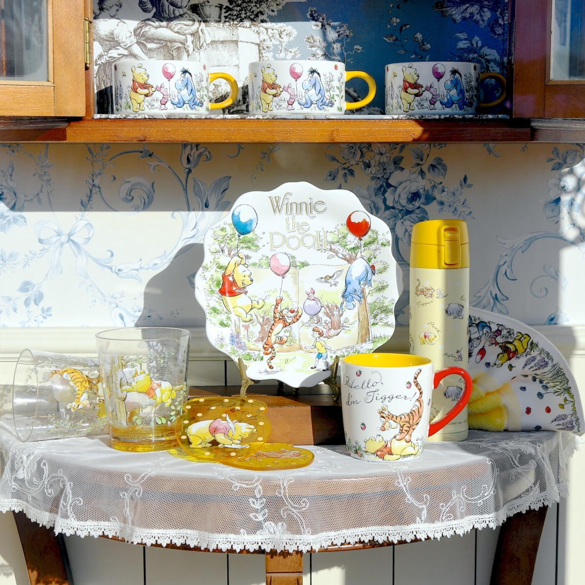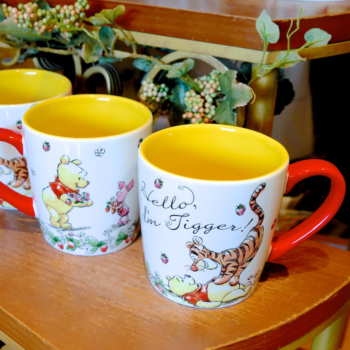 自己紹介するティガーとプーさん、ベリーをもった笑顔のプーさんとピグレットがデザインされたカラフルなマグカップ。