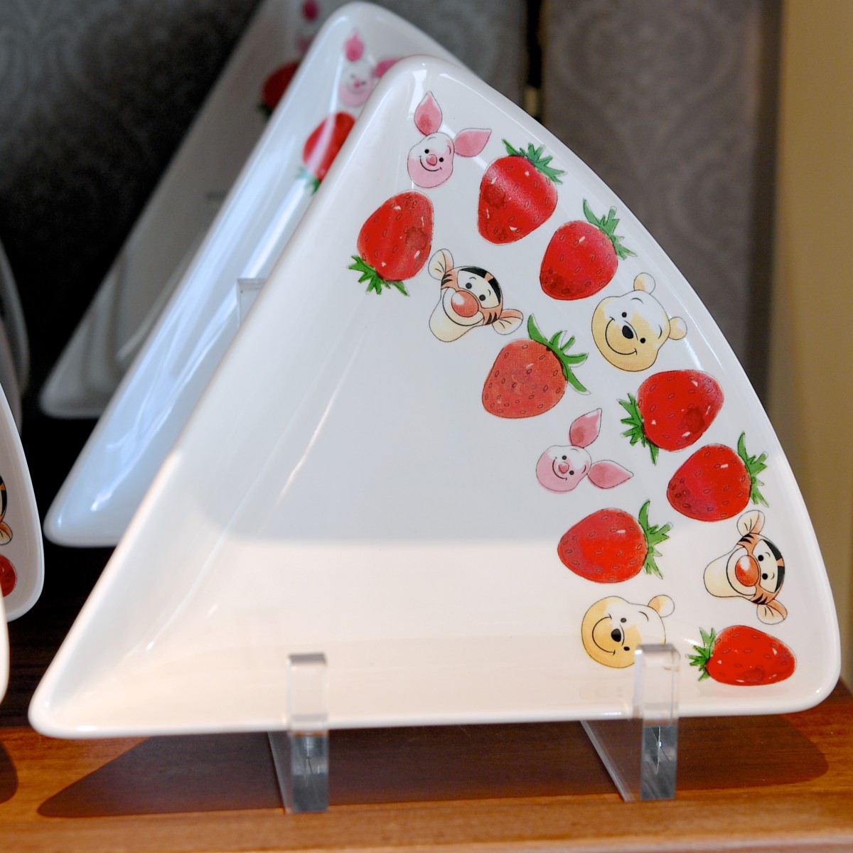 プーさん、ピグレット、ティガーのお顔といちごがデザインされたカラフルなお皿。