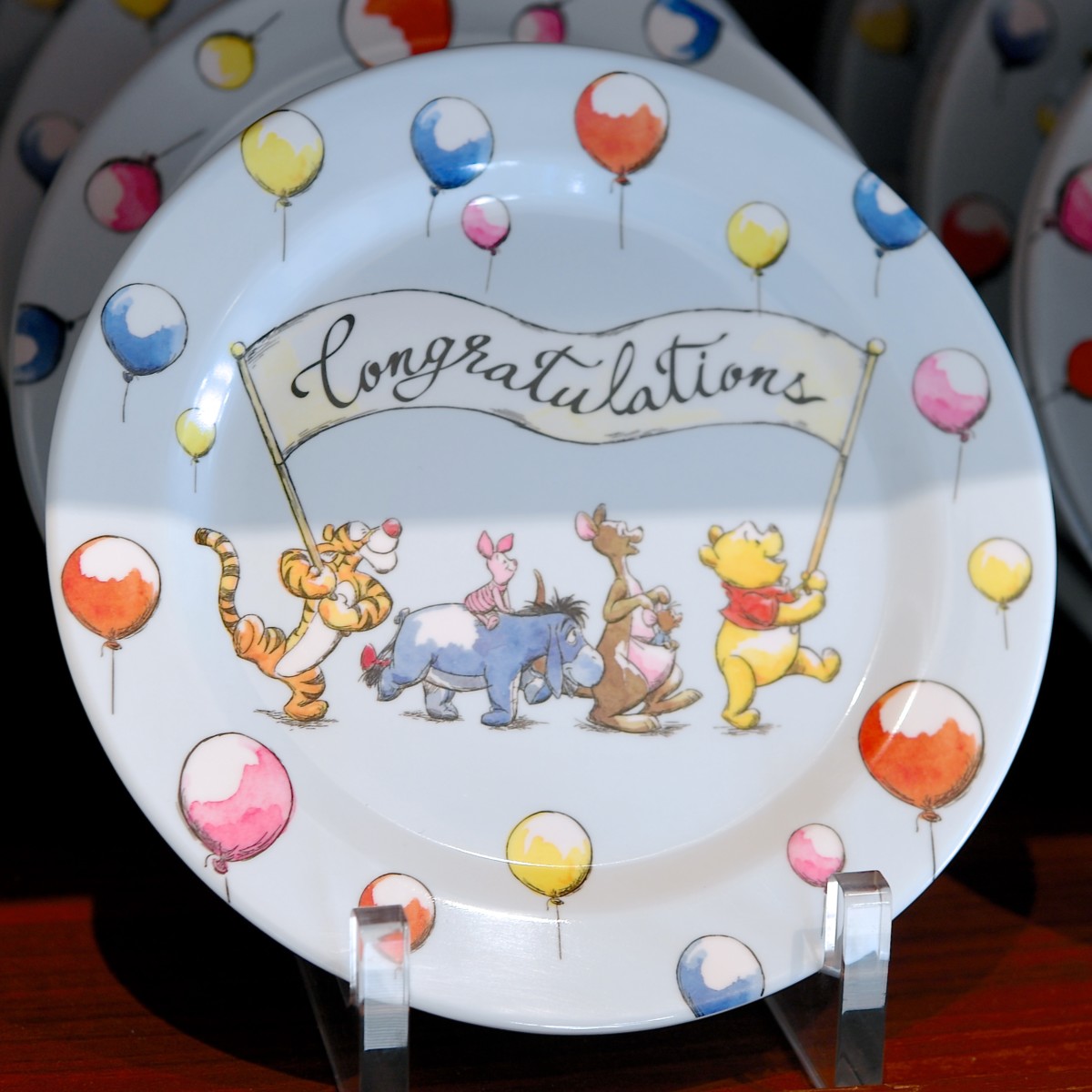 Congratulationsの旗を持ったプーさん、カンガ、ルー、イーヨー、ピグレット、ティガーとカラフルな風船がデザインされたプレート。